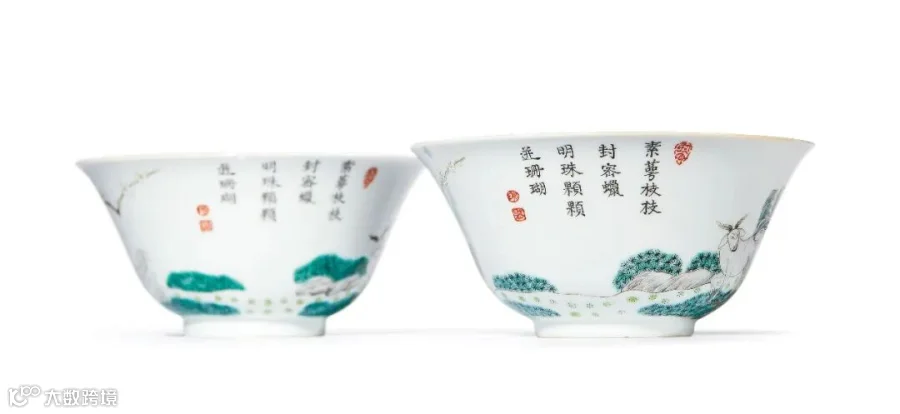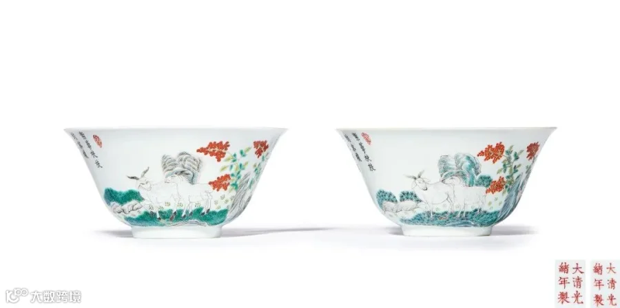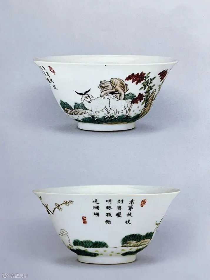 此对碗撇口,深弧腹,圈足,通景粉彩绘三隻白羊漫步于天竺,牡丹,腊梅丛中,悠闲自得,留白处御题”素萼枝枝封蜜蜡,明珠颗颗迸珊瑚”,落款”先春”,”香清”,”色古”三方矾红小印。