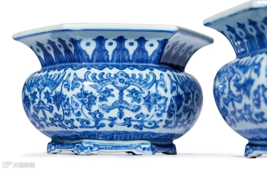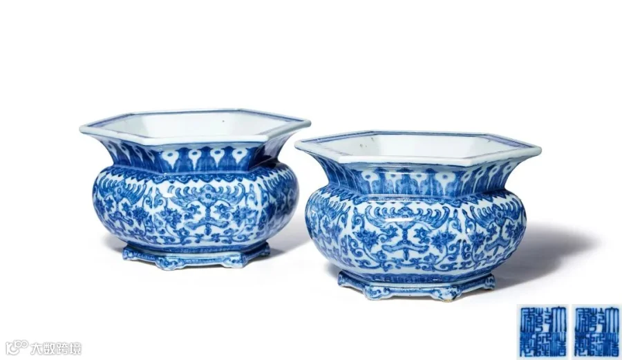 六方形花盆撇口,扁腹,腹壁较浅,下承如意形足,盆底双孔。此对拍品制器考究,口沿下饰变形蕉叶纹一周,外壁满绘青花缠枝莲托福庆有余主题图案,层次清晰,布局疏密有致,典雅隽秀。青花发色纯正妍丽,局部复笔点染,模仿明代永乐、宣德苏麻离青料铁锈斑的效果。