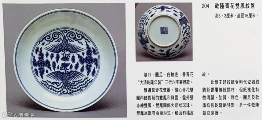 此盘敞口、弧壁、矮圈足。通体白釉为底,青花作饰。盘心、盘口沿均饰青花双线纹,盘心青花双圈内有两隻绘工对称的凤凰,俗称“对头凤”,其间绘以朵云纹。外壁口沿一圈青花纹,足上饰双线青花纹,外壁饰一对凤凰如意云纹,以十字云分隔。盘底落青花“大清乾隆年制”六字三行篆书款。