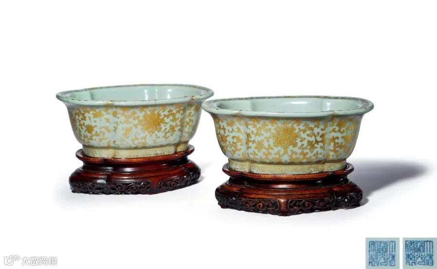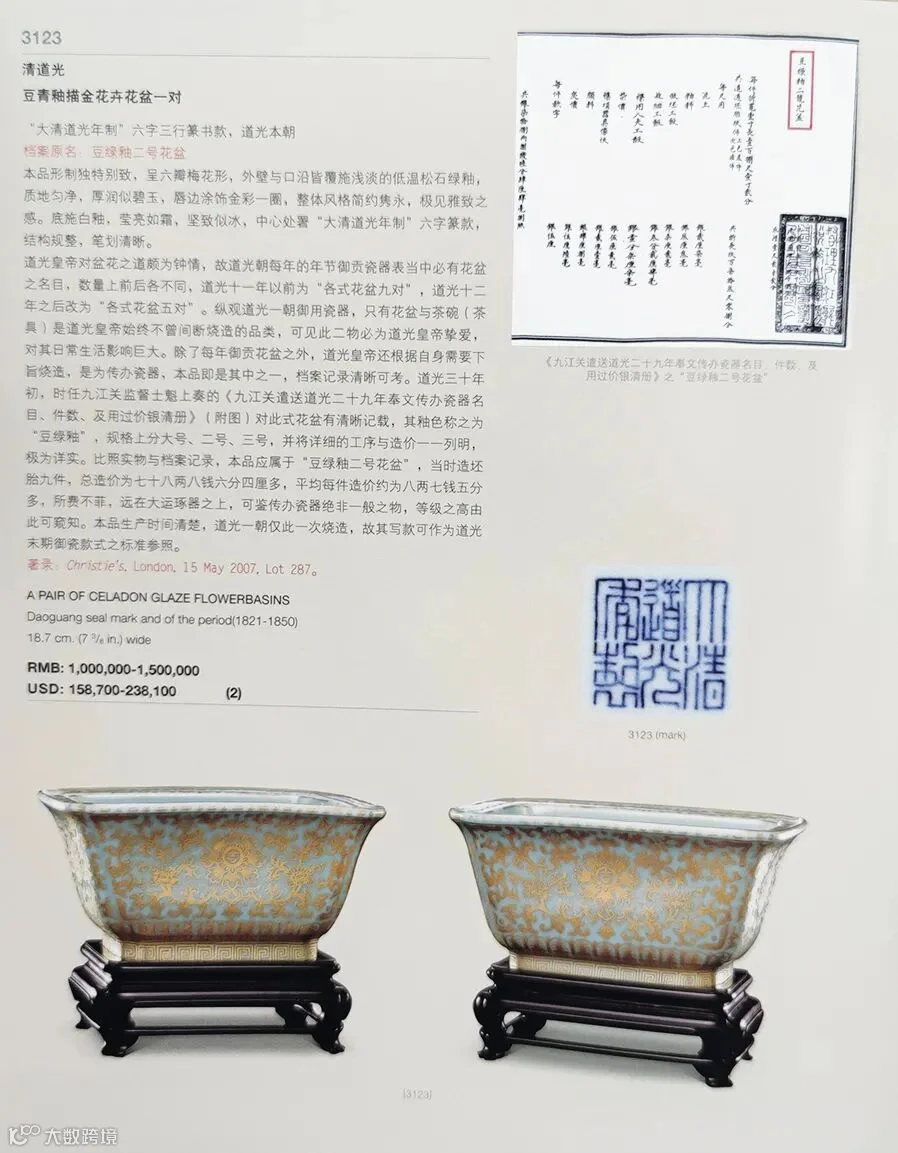 参阅:中国嘉德 2011 秋拍,慎德明道——五台山人藏清道光御瓷(二)专场,Lot3123 清道光 豆青釉描金花卉花盆一对,成交价(RMB):1,840,000