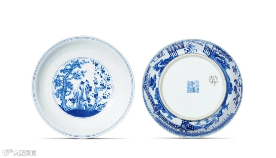此对青花岁寒三友盘成对保存,规格、形制、纹饰均同,呈现统一庄重雅致之态。盘器敞口,弧壁,浅圈足,平底,器表以白釉为底,青花为色,胎质细腻,釉面洁白,内外施透明釉,釉汁莹润光亮。外壁以青花绘庭院人物,盘心绘“松竹梅”岁寒三友图案,描绘清秀精致,色泽鲜丽淡雅,使于清幽典正之中富于装饰意味。松竹梅三景共置园形构图之中,作左中右分别绘制,松树腊梅依圆形构图作向内曲折之姿,松枝周圆饱满,梅树繁花满枝,中间竹叶依山石而生,三五成组点缀左右。盘器外壁环周作屋室庭院景致,清雅宁静,沿口作卷云装饰,宛若仙宫幻境,意境玄妙。为官窑仿古佳器,成对保存,较为难得。