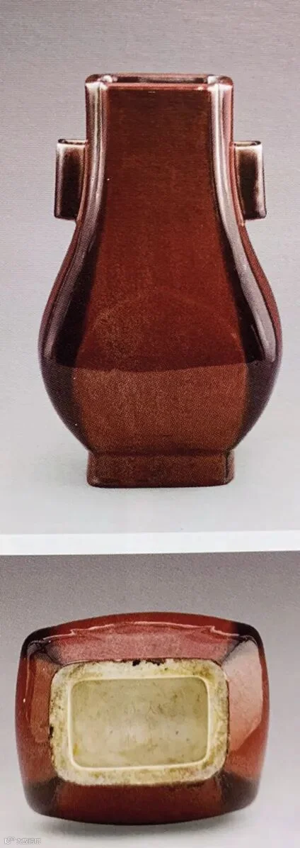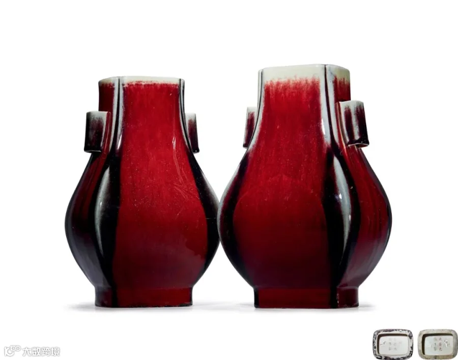 此对贯耳瓶器形源自上古青铜器,宋代时开始出现瓷器品种。拍品口沿呈海棠形,颈部两侧饰贯耳,腹部下垂,两面分饰桃形凸起,下承圈足,整器造型端庄挺拔、古朴大气。瓶通体施窑变釉,釉汁肥厚斑斓。窑变釉是一种以铜红釉为主,并添加多种金属元素烧制而成的高温釉,为唐英督理景德镇御窑厂时仿钧窑釉色所繁衍出的一个创新品种。借用唐诗来赞美窑变釉恰如其分,“高山云雾霞一朵,烟光空中星满天,峡峪飞瀑兔丝缕,夕阳紫翠忽成岚”。贯耳瓶是窑变釉器物的典型造型之一,自乾隆至清代晚期均有烧造。