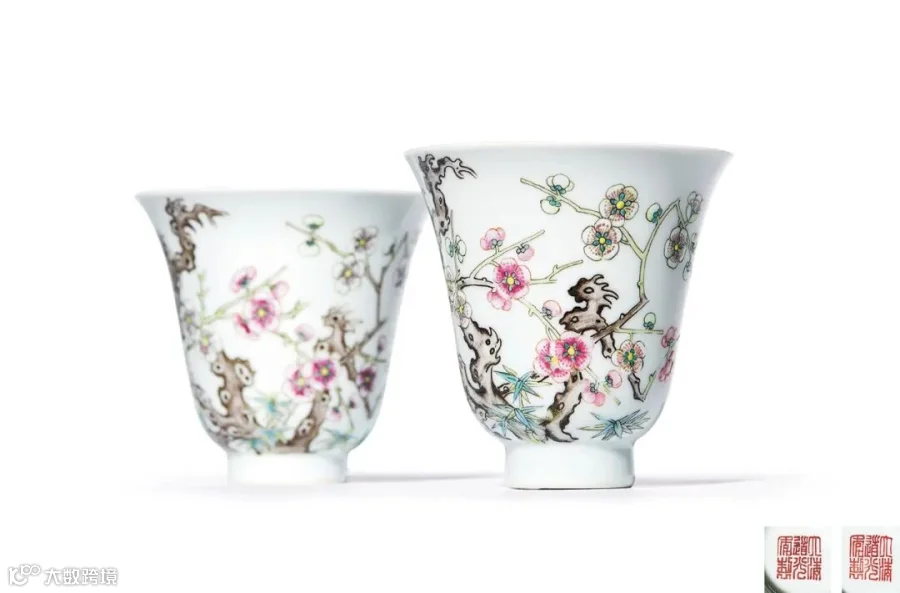 拍品造型规整优美,比例恰到好处。胎骨轻盈细薄,釉层莹白透亮,外壁绘梅竹双清,纹饰颇具古雅之意。杯身彩色艳美厚实,绘画生动传神。