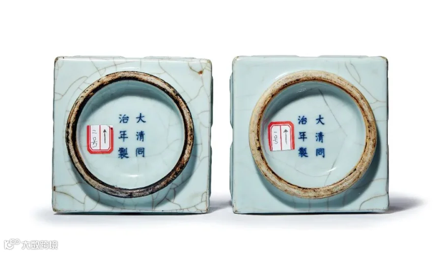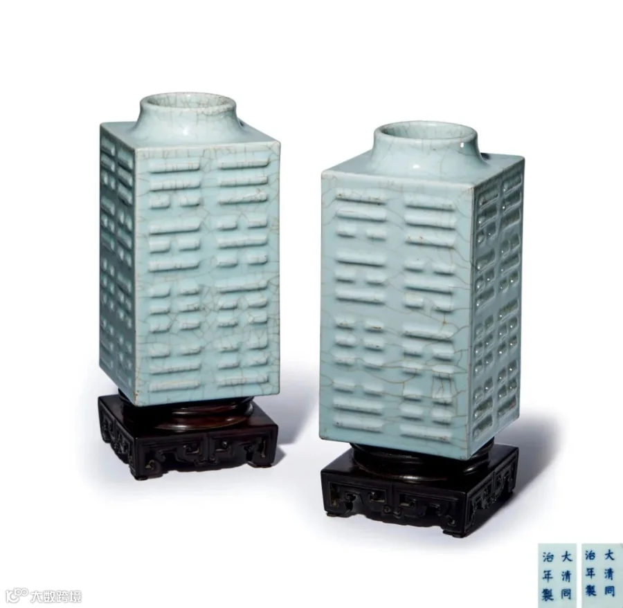 仿哥釉八卦纹琮式瓶一对(原配宫廷底座) 款识:“大清同治年製”六字双行楷书款 高:28 cm. 来源:国营文物商店旧藏