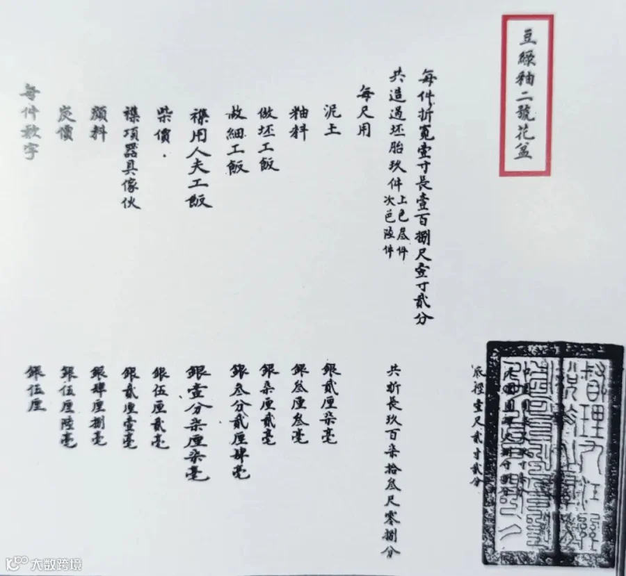 道光皇帝对盆花之道颇为钟情,除了每年御贡花盆之外,道光皇帝还根据自身需要下旨烧造,是为传办瓷器,本品即是其中之一,档案记录清晰可考。道光三十年初,时任九江关监督士魁上奏的《九江关遣送道光二十九年奉文传办瓷器名目、件数、及用过价银清册》对此式花盆有清晰记载,其釉色称之为“豆绿釉”,规格上分大号、二号、三号,并将详细的工序与造价一一列明,极为详实。本品生产时间清楚,道光一朝仅此一次烧造,故其写款可作为道光时期御瓷款式之标准参照。