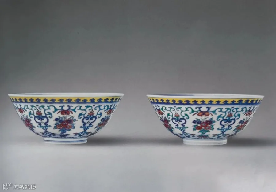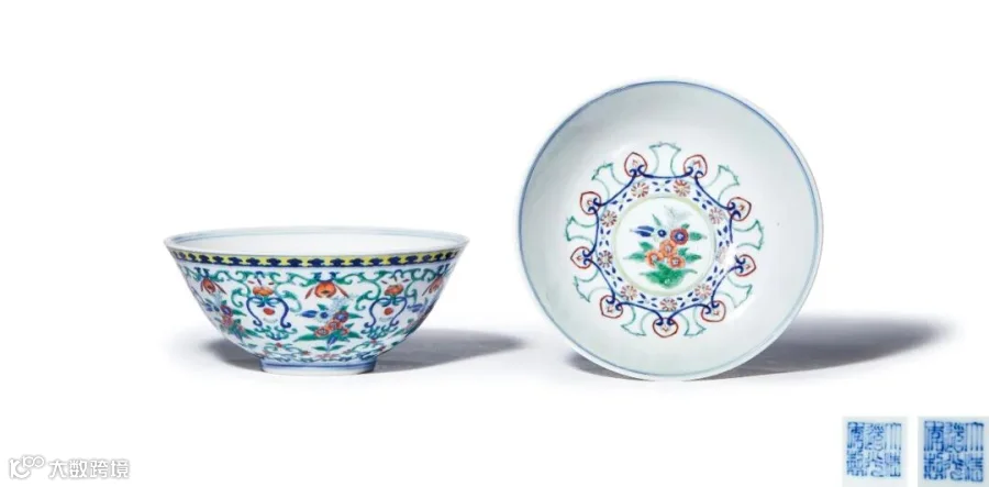 此类斗彩碗为清代官窑之传统品种,其造型、纹样承袭自雍正时期斗彩碗,可参见北京故宫博物院藏雍正朝斗彩花卉纹碗。碗型端正,内外壁满施白釉,口沿外施一周黄色地青花云纹带,外壁绘六组斗彩折枝并蒂花卉,间隔以俯仰勾连花纹,并有寿桃、石榴点缀其间,十分精美。碗心中央绘有一簇花纹,周围绘花卉纹和贯套纹各一周以拱卫中心花簇。整器釉色莹润,青花发色淡雅,缠枝莲纹以青花绘出轮廓,其间准确填以橙、黄、绿、蓝等釉上彩。线条流畅,花团锦簇,色调绚丽多彩,纹样优雅,寓意吉祥如意,显得富丽华贵。成对保存,更为不易。