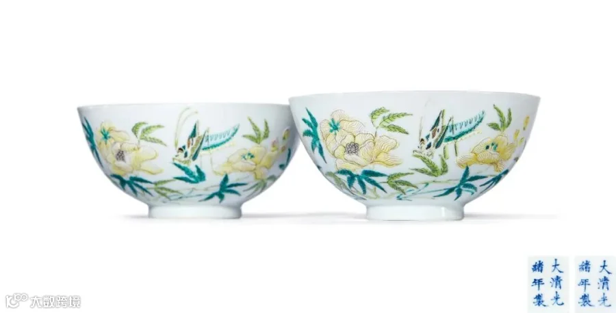 此对拍品撇口,浅弧腹,圈足。拍品造型精巧雅致,白釉为地,上以粉彩绘花卉蝈蝈纹,以墨彩勾勒纹饰边线,粉彩填色,大面积的彩料晕染花叶,花枝娇贵粉嫩,浓染淡抹,其上一隻蝈蝈,刻画细腻,生动传神。十九世纪初期,蝈蝈或笼中蝈蝈是流行的装饰题材。蝈蝈谐音“国”,整个装饰主题代表国泰民安。以“国泰民安”为装饰主题,表达了人对国家稳定的愿景与期盼。拍品成对保存至今,殊为不易。