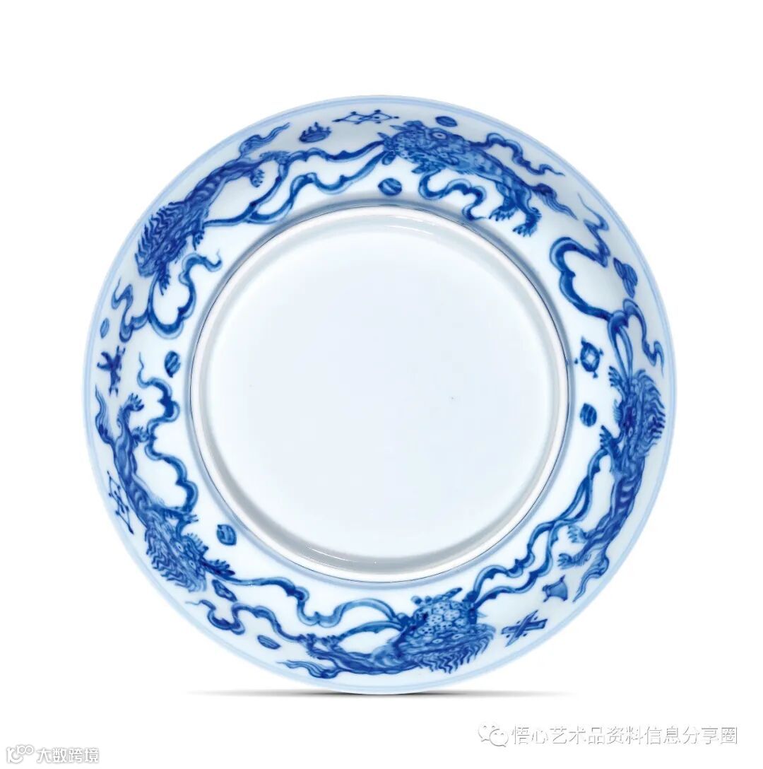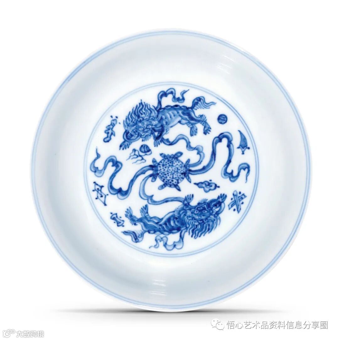 北京大羿2021年春拍《龙焱》专场,编号314——明成化 瑞狮戏球纹盘,浅壁撇口,腹部弧线饱满,器形俏丽。盘心及外壁以青花描绘狮戏绣球纹,憨态可掬,周围缀以杂宝纹。盘心狮子分居绣球两侧,呈上下俯仰相迎之态,而外壁五只相向而行,或口衔飘带,或怀抱绣球,生动鲜活。纹饰以青花勾边再加渲染,描绘清晰精致,青花发色清丽。