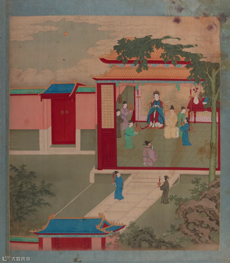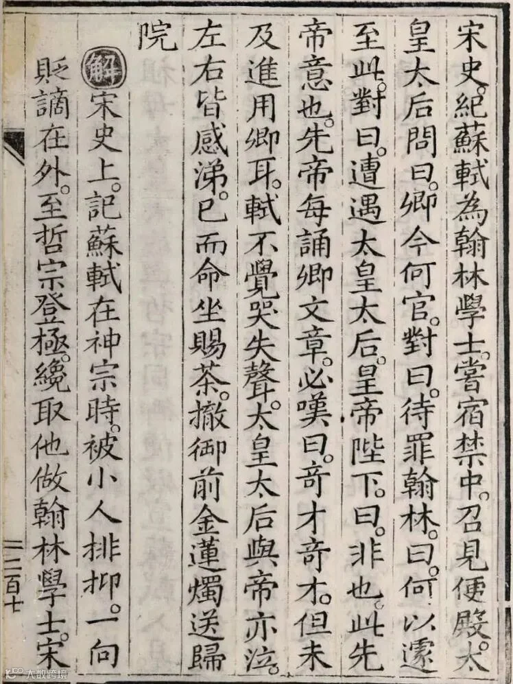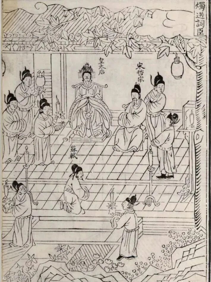虽然此书原稿已佚,但有多个晚明刊印版本留存。现藏于法国国家图书馆的《帝鉴图说》彩绘册页“赐烛词臣”(图2)中,高太后端坐于堂中,哲宗位于太后左下侧,苏轼侧身跪于堂前,场景描绘符合夜值锁院的历史叙事。彩绘册页中没有对人物关系做出注解,但在明纯忠堂藏本插图以及中国古版画图书收录的《帝鉴图说》(图1和图3)中皆明确标注了高太后、宋哲宗和苏轼三人的身份,可作辅证。