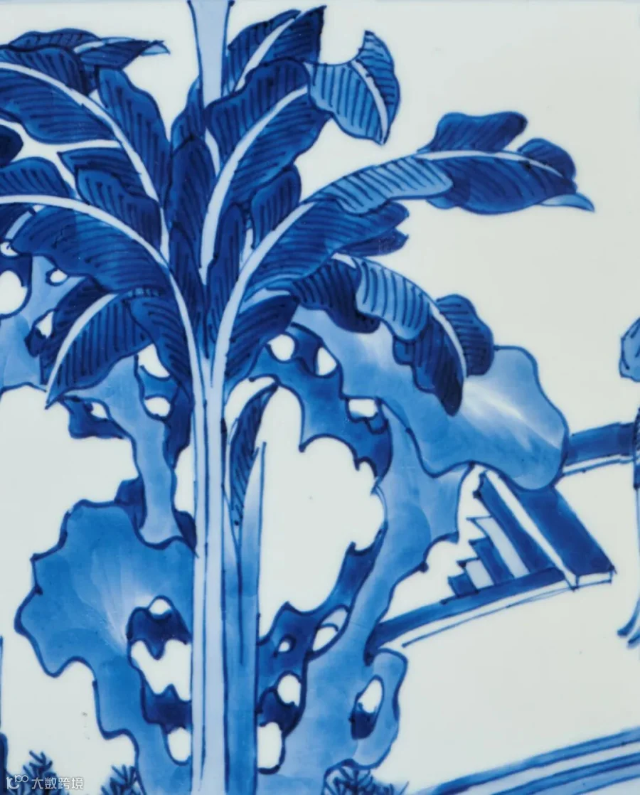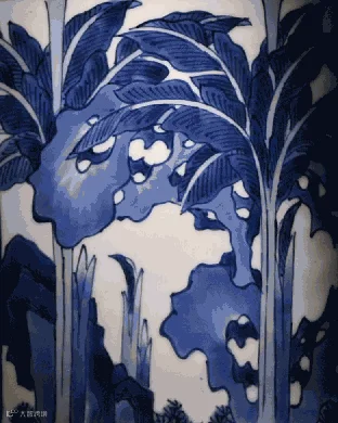 近景山石皱染,并用披麻皴法点染山石树木,质感强烈。所绘青花妍丽秀雅,有浓淡深浅之别,笔触皴染得宜,分水技法炉火纯青,当为康窑青花「蓝分五色」之典型。