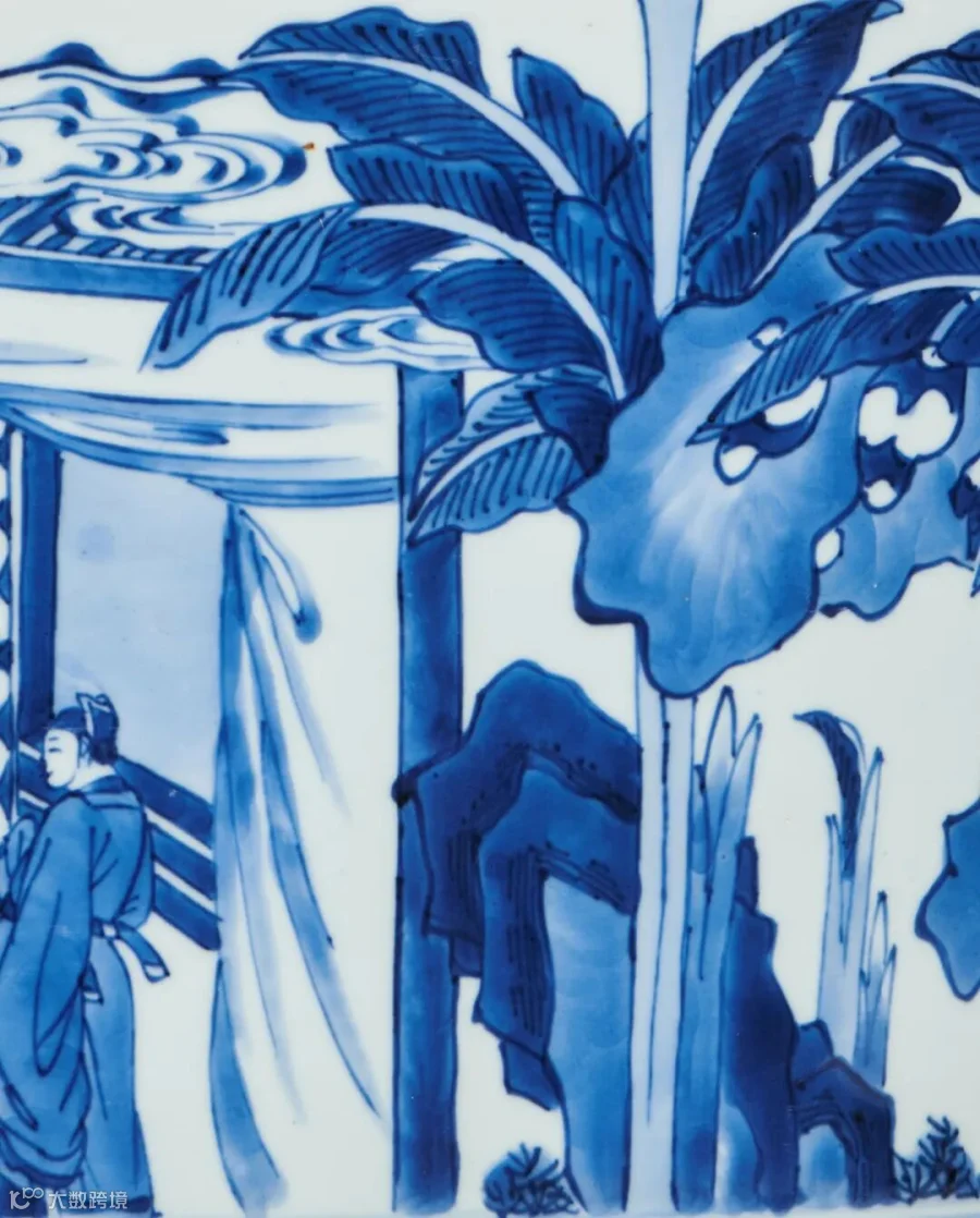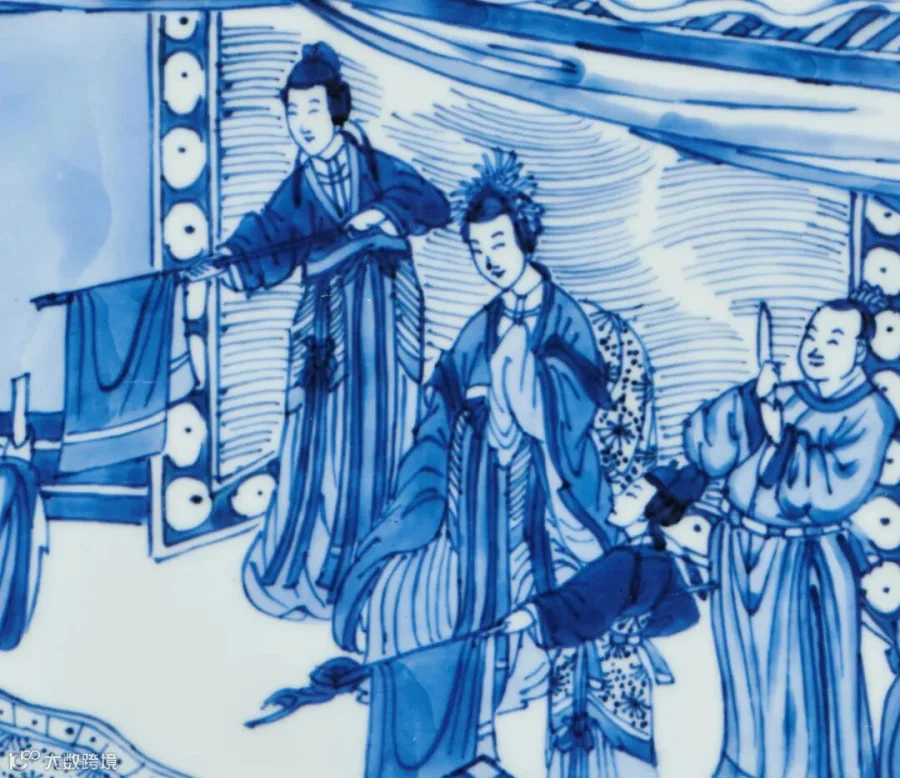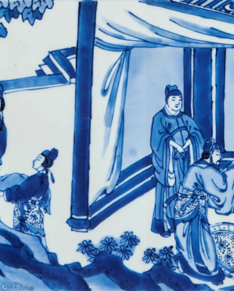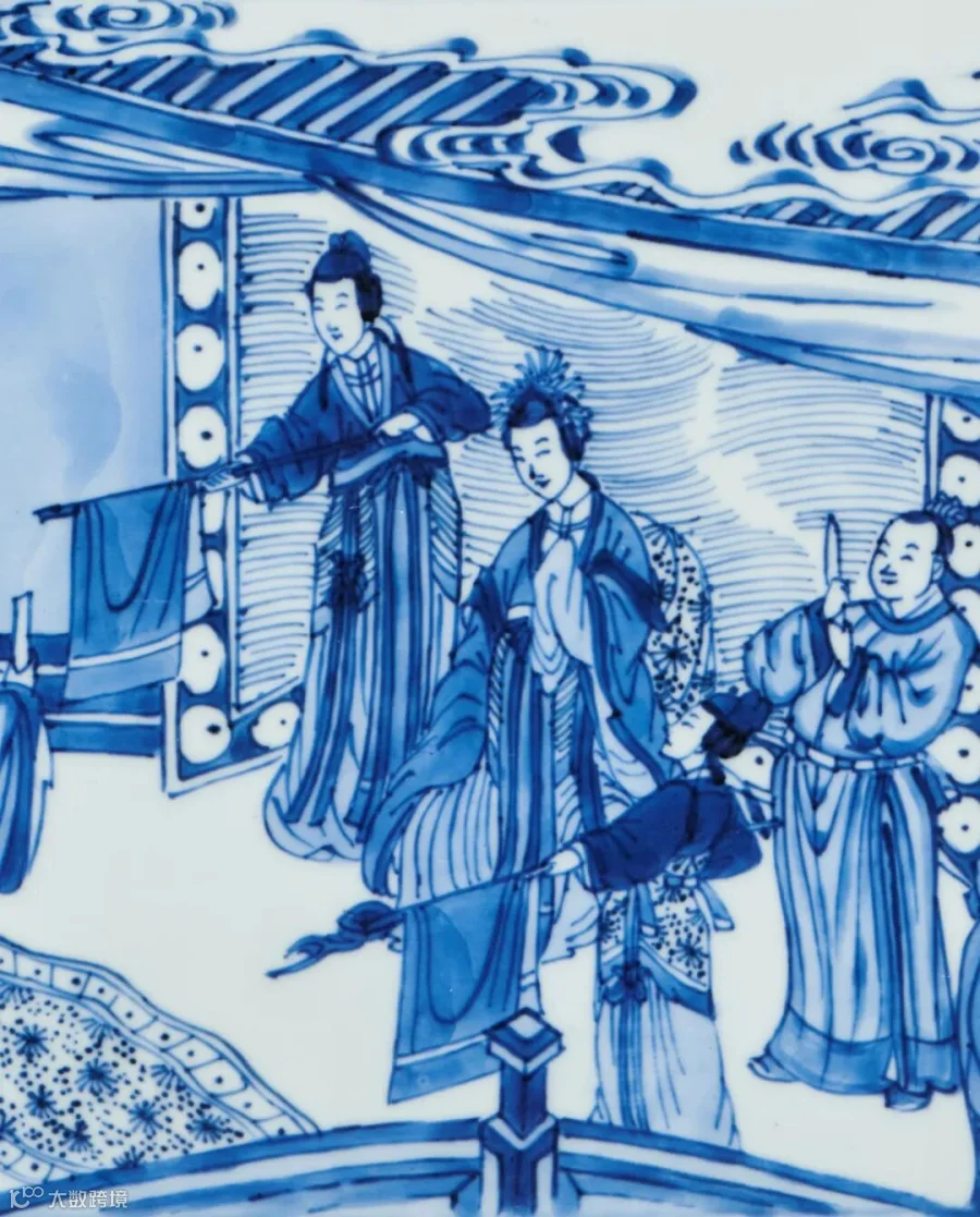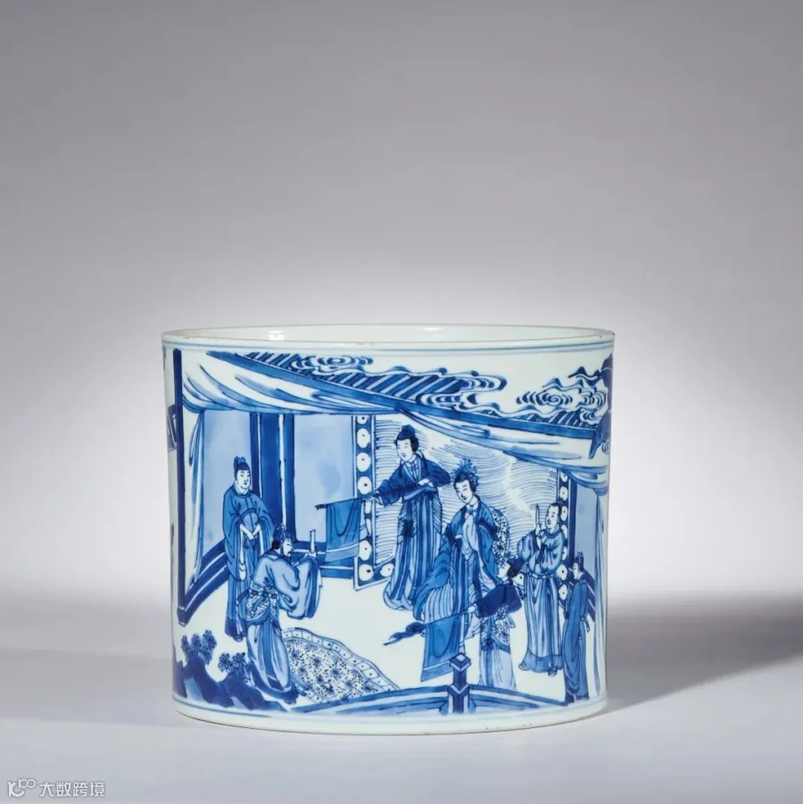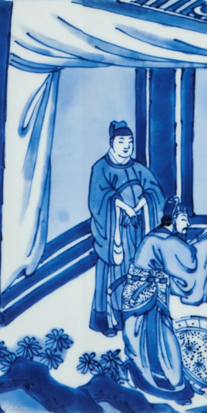 康熙时期由于戏曲、小说的流行,版画艺术也随之发展迅速,对瓷器纹饰产生了重要影响,尤其青花瓷器多以戏曲、小说、历史故事场景为装饰纹样,拍品即为在此背景下生产的青花人物故事图瓷器佳作。