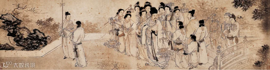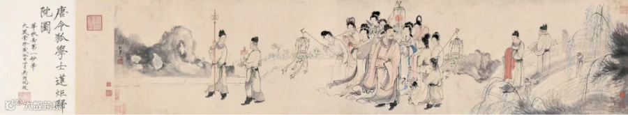 《帝鉴图说》侧重于表现君臣会面的场景,而明代张路、清代邹一桂、华嵒、任熏等“赐烛归院”主题画,则描绘的归院途中。张路《苏轼回翰林院图》(图4)绘苏轼被一群持灯、抱琴的侍女簇拥,左右身侧各有一名侍女持金莲灯引路。华嵒《莲炬归院图》(图5)构图与张路作品高度形似,画中人物减少至15人,题跋“唐令狐学士莲炬归院图”。