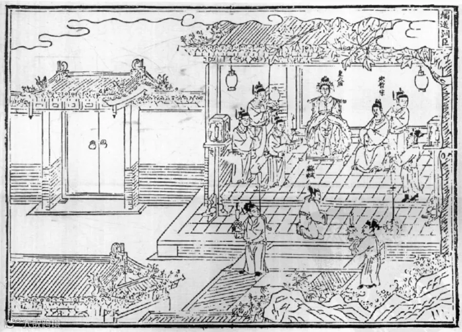 张居正《帝鉴图说》上卷“圣哲芳规”中“烛送词臣”,依据《宋史·苏轼传》的内容编录,插图中人物特征鲜明,情节生动。张居正通过此书强调“鉴戒”的作用,既要劝诫皇帝礼贤臣子,又渲染了忠君事君、君臣之义的政治伦理,同时也表明了君臣一心的场景。