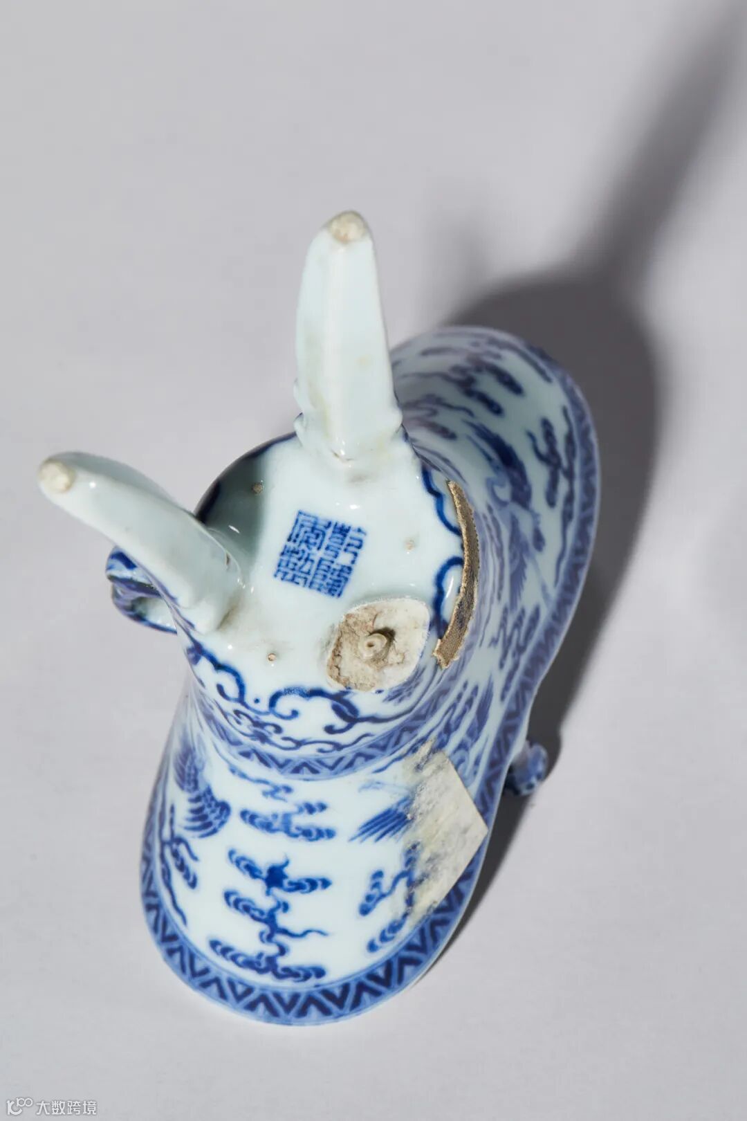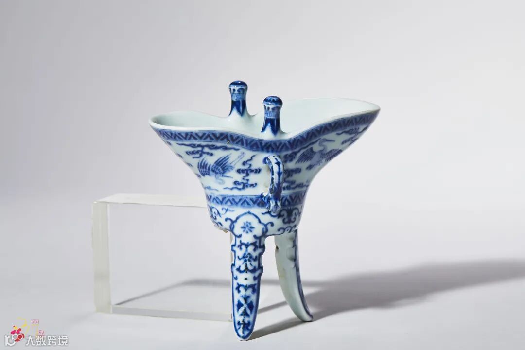 明清宫廷礼仪档案中均有“天子用爵,群臣饮盏”之礼制。拍品造型仿自商周青铜爵之造型,口沿前后两侧为弧形长流,左右两侧各有立柱耳,腹部一边有回纹形环把,便于手持,设计灵巧。下承三个尖状长足,器身青花为饰,爵身主体纹饰为云鹤纹,寓意长寿。三足以变形蕉叶装饰,构思巧妙。以青铜器古朴瑰丽的造型与清代纹饰相结合,焕发出新颖的艺术魅力。