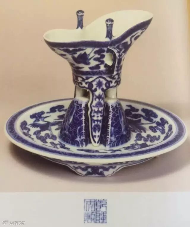 英国维多利亚与阿尔伯特博物馆收藏之乾隆青花江崖海水云鹤纹爵杯与托盘