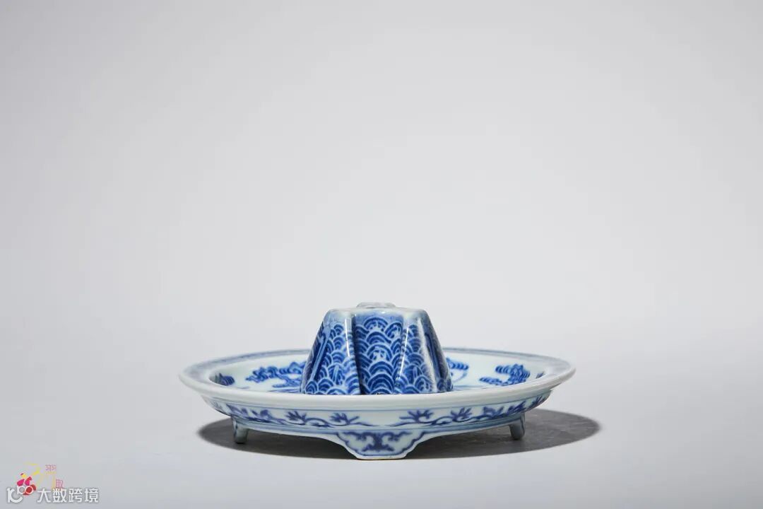 此类器型在官窑烧造档案中被称为“青花白地江山一统爵盘”,乾隆八年六月曾有烧造记录,应为宫廷礼器。中间起台,台有三条凹槽,用以插爵足。底部呈浅圈足,裹足支烧,见有细小的支烧点,圈足下另有四只扁形足。托台上以青花绘海水江崖纹,盘内绘云鹤纹,外壁饰四组折枝莲纹,寓意吉祥。底款为特殊的四字款,笔意纤细,字小而缩于底心。相同藏品见有南京博物院收藏。