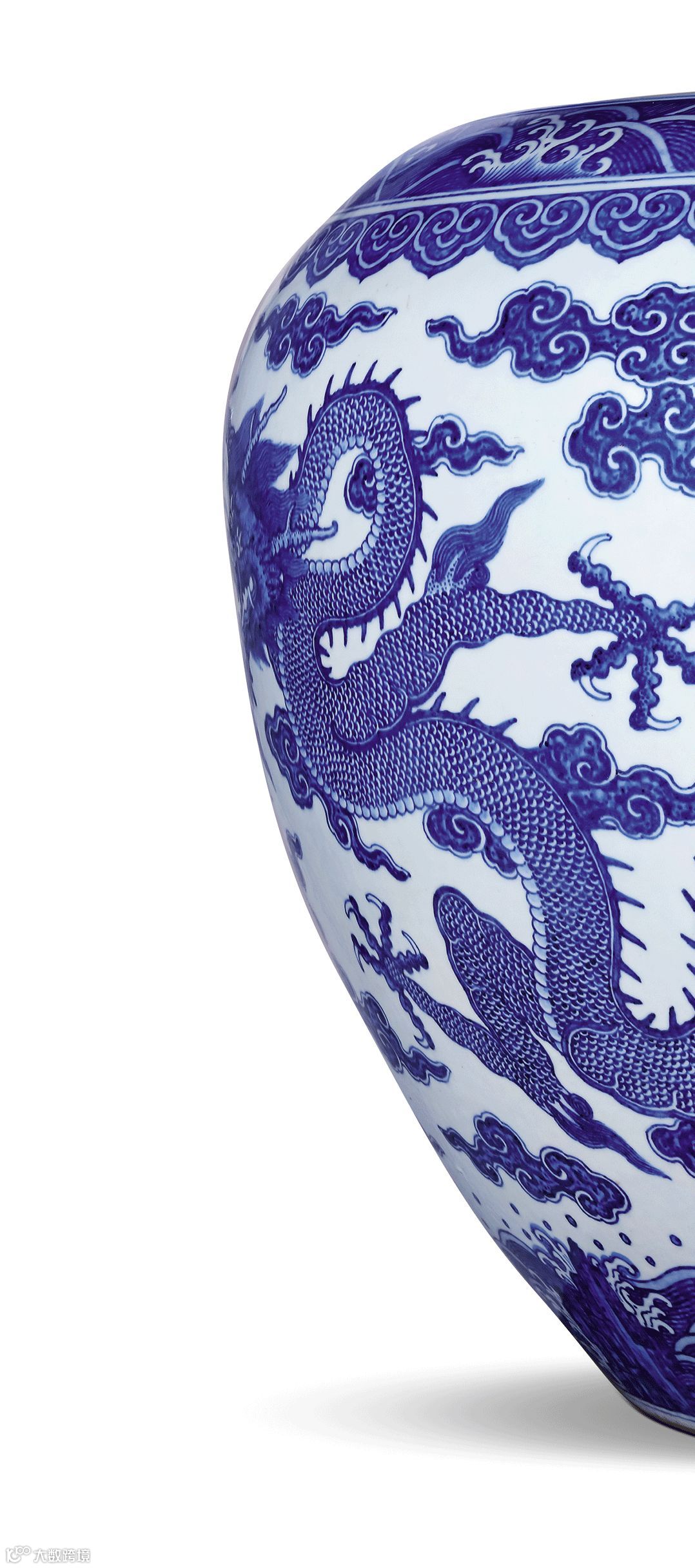 拍品外壁通体以青花为饰,口沿及颈部饰以海水纹及如意云头纹,腹部绘双龙戏珠纹,龙口大张,怒目圆瞪,龙须飞扬向上,张牙舞爪,周围云焰翻飞其间,下承海水江崖,波涛汹涌,寓意大清王朝江山一统,国本永固。整体纹饰将帝王威武庄严的形象体现的淋漓尽致,颇得雍正龙形遗风,应为乾隆早期所制。全器釉质温润肥厚,青花鲜艳翠亮,发色沉稳,画工一气呵成,风格华美典雅,装饰性极强,为典型乾隆宫廷陈设大器。足底露胎,底部中央青花书“大清乾隆年製”六字篆书款。全器满饰花纹,布局得当,给人以繁而不乱、清爽秀丽的感觉,青花呈色亦非常纯正。