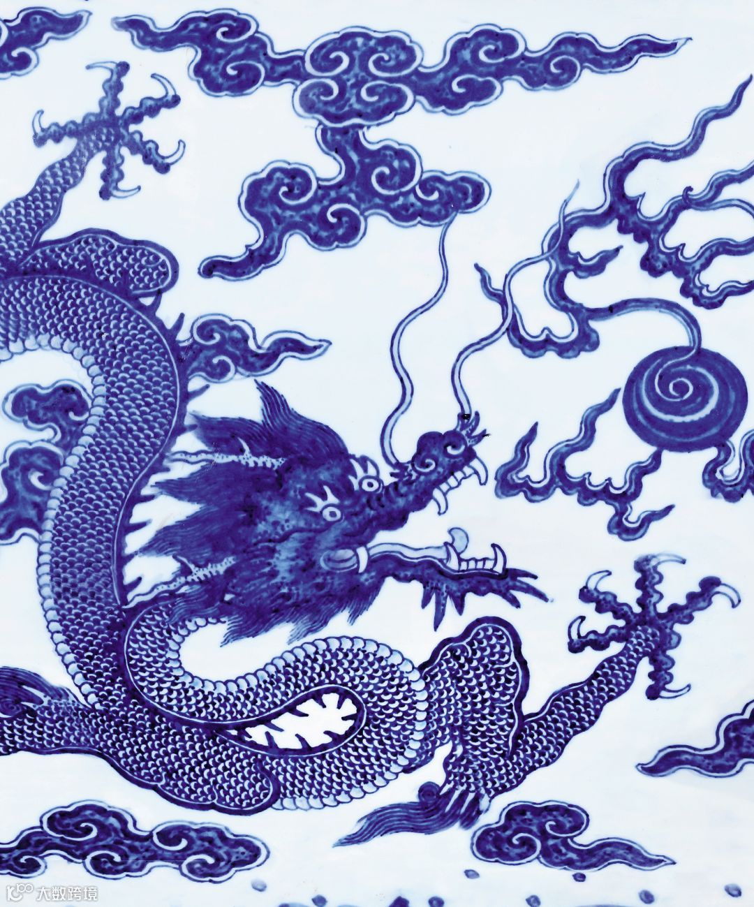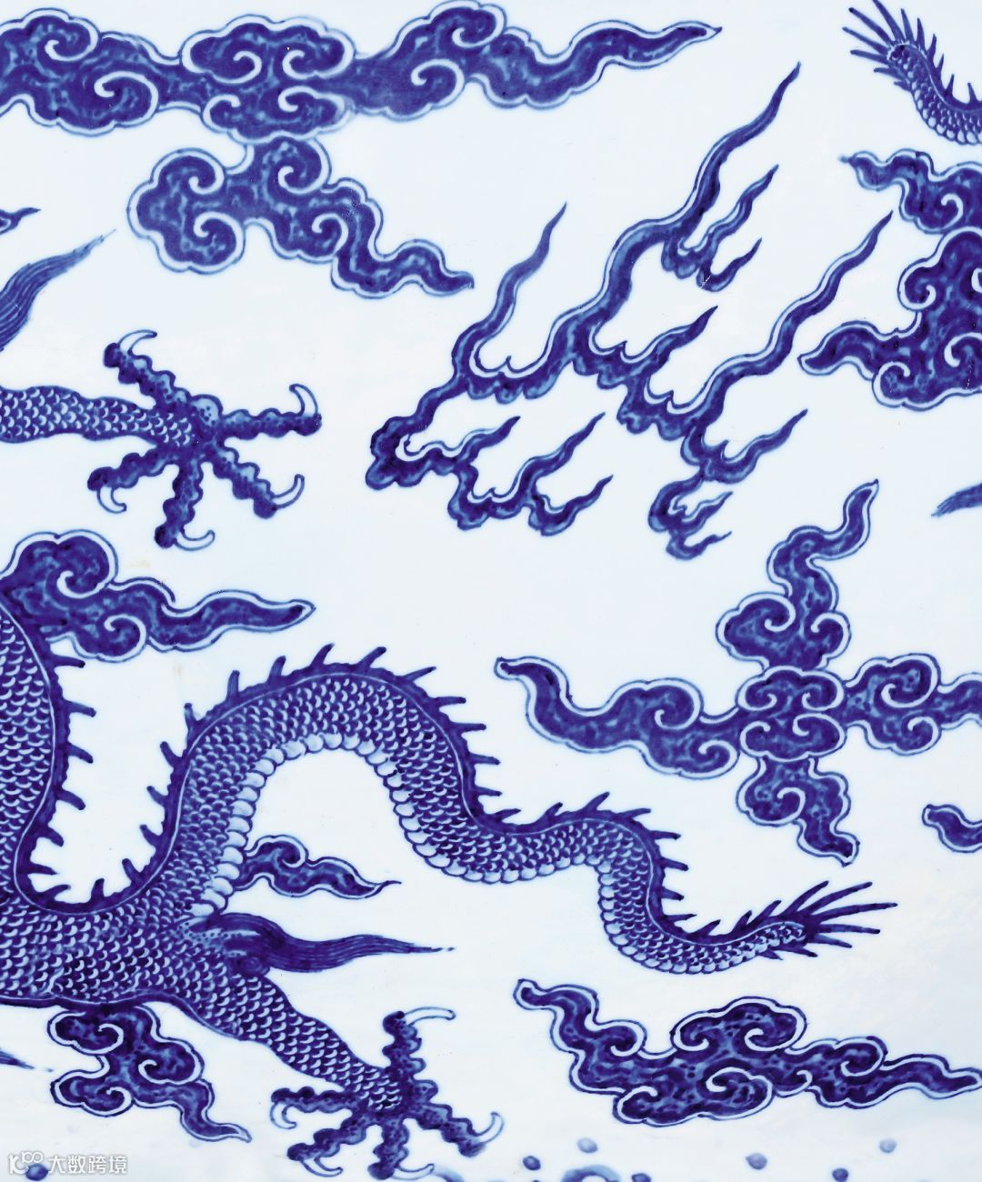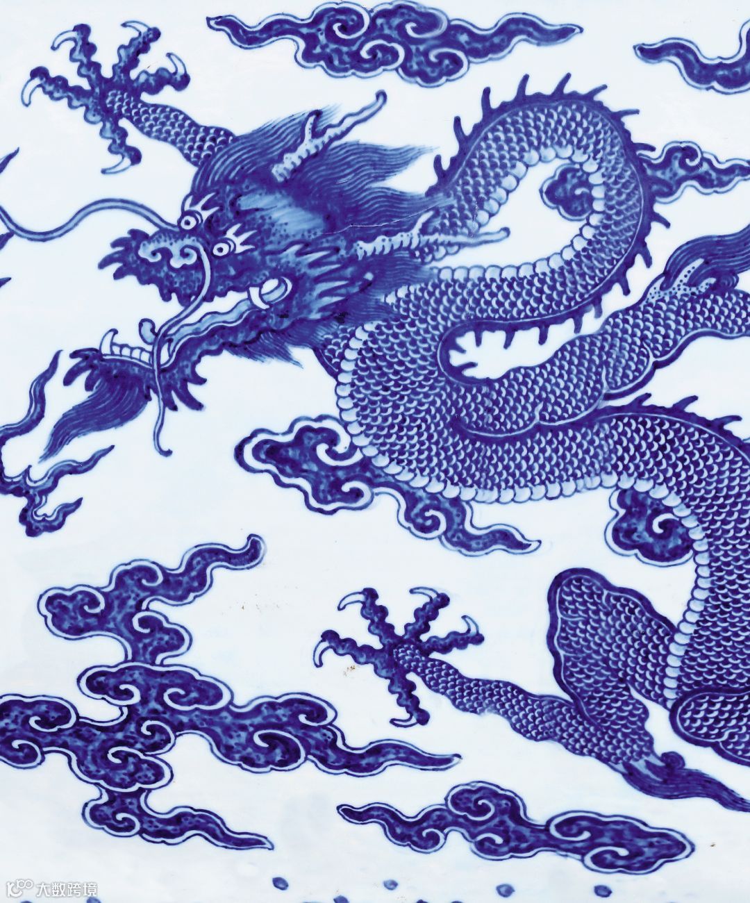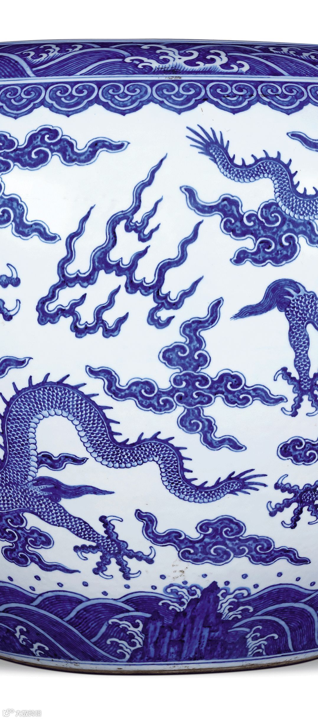 大卷缸形体硕大,外壁通体以青花为饰,口沿及颈部饰以海水纹及如意云头纹,腹部绘双龙戏珠纹,龙口大张,怒目圆瞪,龙须飞扬向上,张牙舞爪,周围云焰翻飞其间,下承海水江崖,波涛汹涌,寓意大清王朝江山一统,国本永固。整体纹饰将帝王威武庄严的形象体现的淋漓尽致,颇得雍正龙形遗风,应为乾隆早期所制。全器釉质温润肥厚,青花鲜艳翠亮,发色沉稳,画工一气呵成,风格华美典雅,装饰性极强,为典型乾隆宫廷陈设大器。足底露胎,底部中央青花书“大清乾隆年制”六字三行篆书款。
