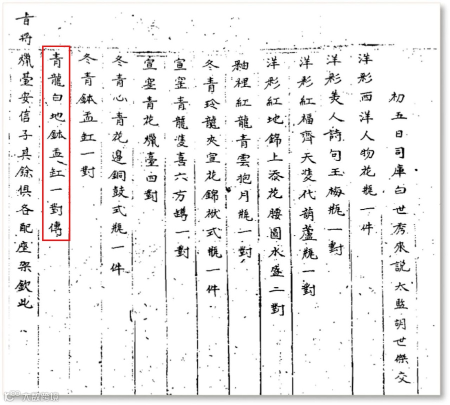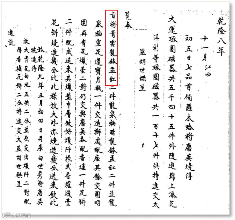 结合清档记载此大卷缸只于乾隆八年烧造过一对,而本次拍卖之青花云龙纹大卷缸与英国皇室所收藏的大卷缸造型、尺寸及纹饰完全一致,款识都为同一人书写,原或为一对。