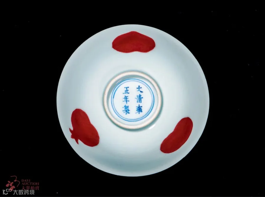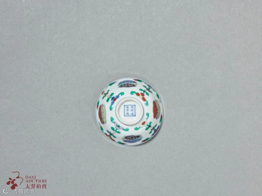 杯外底心青花双方栏内书“大明成化年制”六字双行楷书款。此种落款方式带有明显的追慕成化之意。成化斗彩为明代御窑彩瓷烧制的巅峰,其品质之高,冠绝千古。后世皆以成化斗彩为摹本,竞相仿烧,但其中唯有雍正作品最具成窑风韵,品质丝毫不输成化。藏界习称“明看成化,清看雍正”。