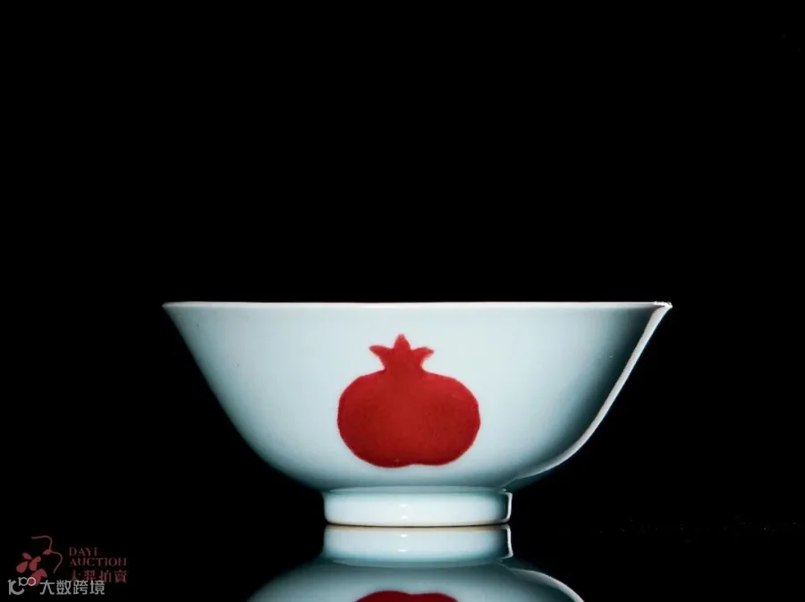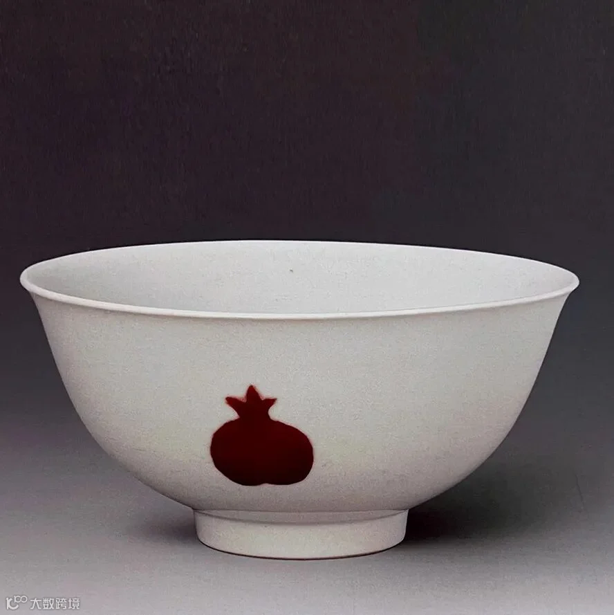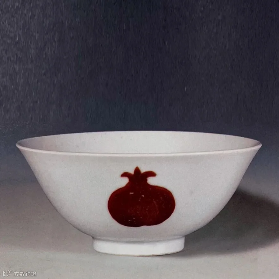 釉里红三果纹始于明代宣德朝,多制碗器,因釉里红烧造难度较大,三果纹亦载承“多子、多福、多寿”之吉祥寓意,故这类作品素为明代官窑之名贵品种。相较宣窑之作,本品造型、纹饰及韵味少一分清冽豪迈,多一分严谨秀雅,器型端庄巧致,胎质坚致莹白,外壁绘釉里红三果纹石榴、蟠桃、柿子,瑞果饱硕红润,呈色鲜艳,白釉莹润白晰,红白相映,别有意趣。
