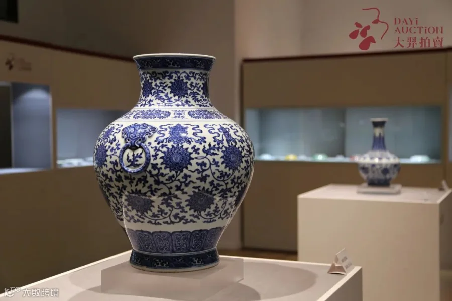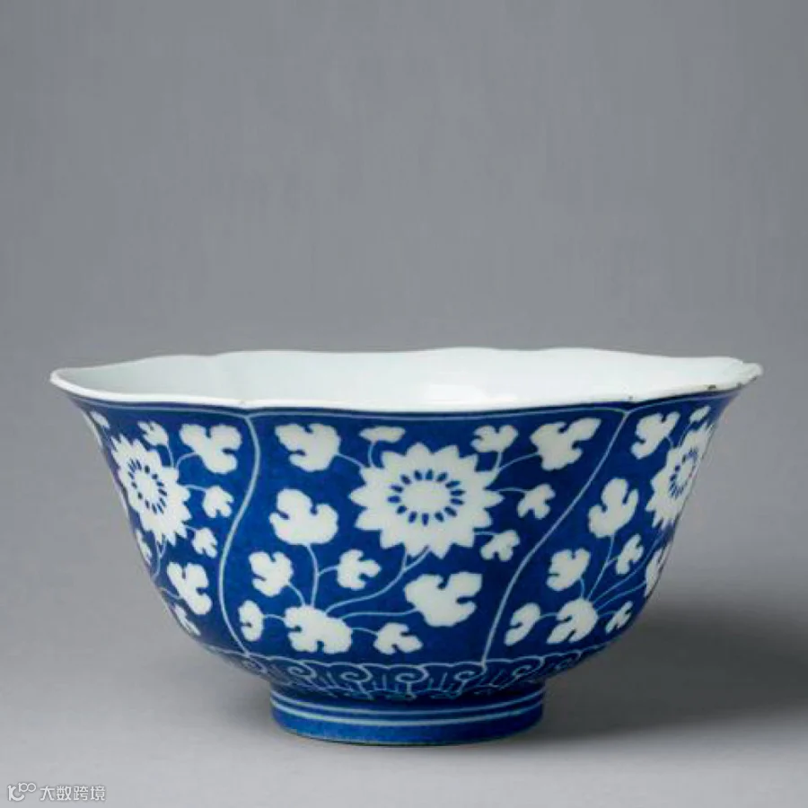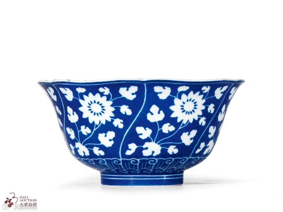 本品品敞口,口沿呈六瓣葵花式,《宋史乐志十五》:“千官云拥,群后葵倾”,杜甫诗云:“葵藿倾太阳,物性固莫夺”,此器取六瓣葵花形纹,更显“六合同春,众心所向”诚挚之意。整体工艺以蓝地留白装饰手法装饰,此类装饰手法始于元代,至雍正时期则更趋精致。制作工序复杂,先于素坯之上沥粉堆塑出缠枝花卉纹饰并覆上白釉,入窑素烧成为瓷胎,继而于素胎之处施上洒蓝釉,二次入窑烧成。
