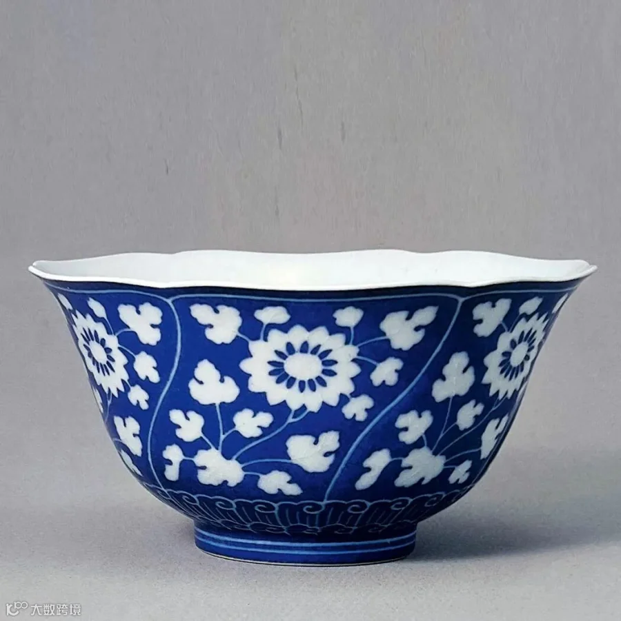 左:清雍正 洒蓝釉留白沥粉折枝菊花纹葵口碗