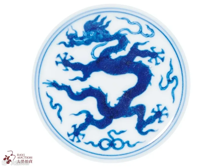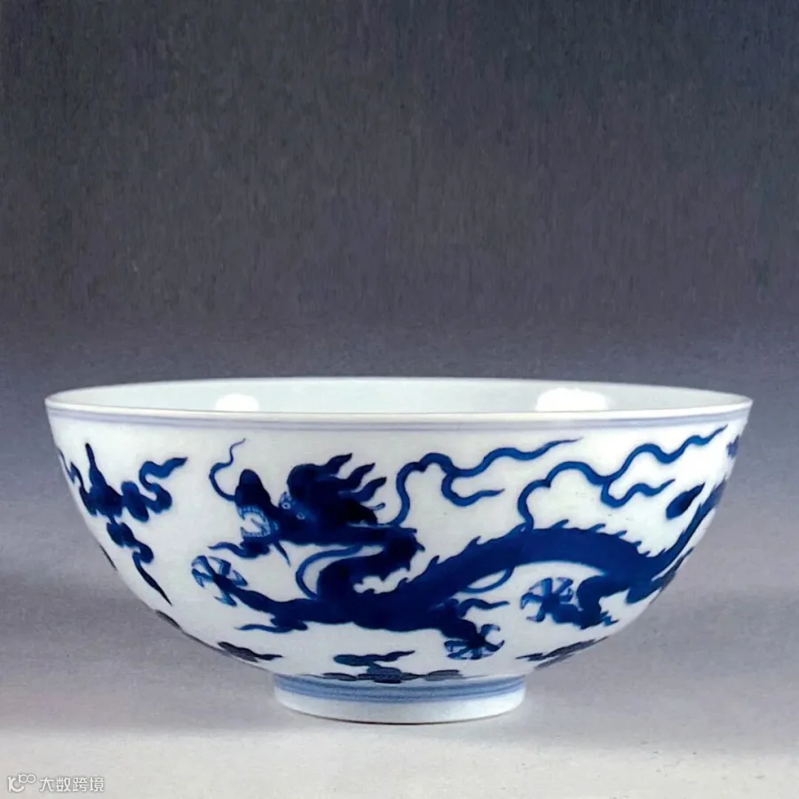 此类碗创烧于雍正,一直流行至道光朝,清宫档案中称之为「嘉窑龙纹碗」,所绘龙纹龙发纷披,形体修长,云朵呈「壬」字形,青花浓艳发紫,颇具明代嘉靖朝神韵,为雍正时期御窑厂仿嘉靖风格器物。整器青花明艳,纹饰采用青花勾线渲染填色,笔触细腻,精巧有神,淡描勾线与渲染相结合,勾画婉转流畅,画法布局既灵活多变又有较强的规律性,使得龙纹造型层次丰富,精细典雅,凸显宫廷龙纹的震慑之感。