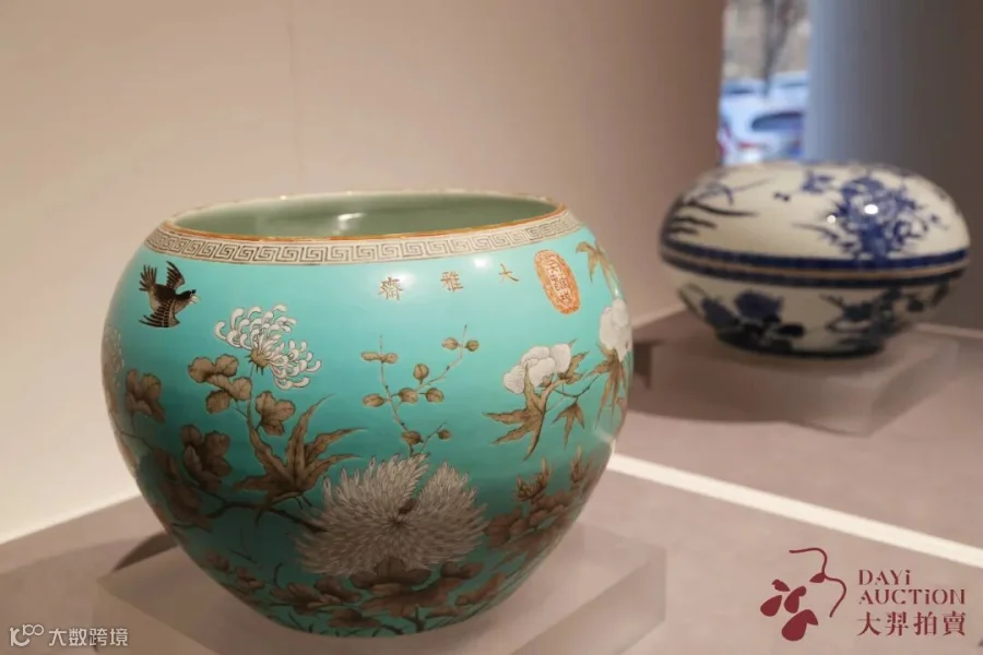 本器外均洒蓝釉底色,淡蓝透白的斑点相间匀称,凸起的六葵瓣上留白六株车矢菊,菊蕊、瓣、叶均用玻璃白料精勾细点,胫部饰仰葵纹,与洒蓝釉面高底相间,富有层次和立体效果,极为养眼,而且蓝白相映,清新别致,深得雅趣风骨。虽然此时洒蓝釉瓷器呈色稳定,做工精细,但由于烧造时的工艺复杂,成功率比较低,因此洒蓝釉瓷器在当时也是比较珍稀的一个品种。本场还征集到另一件清雍正 洒蓝釉作品。