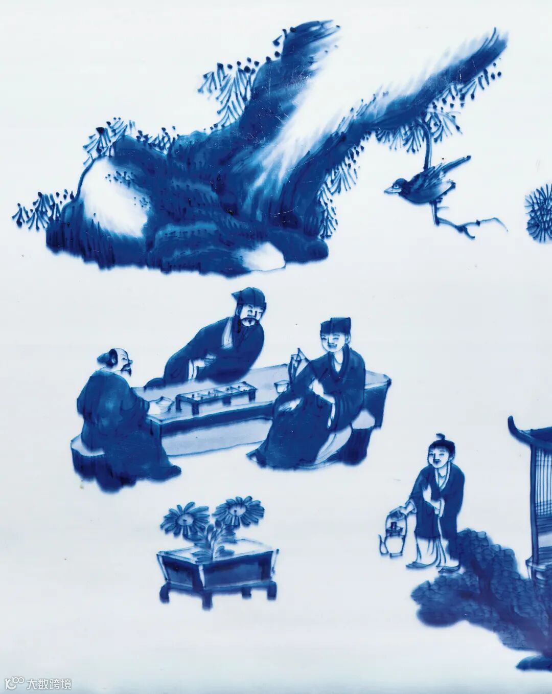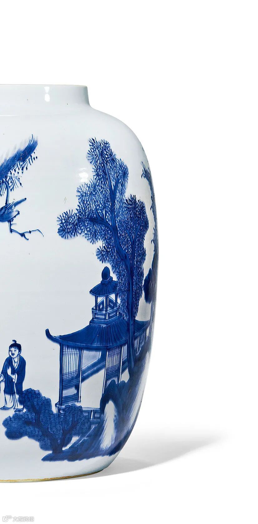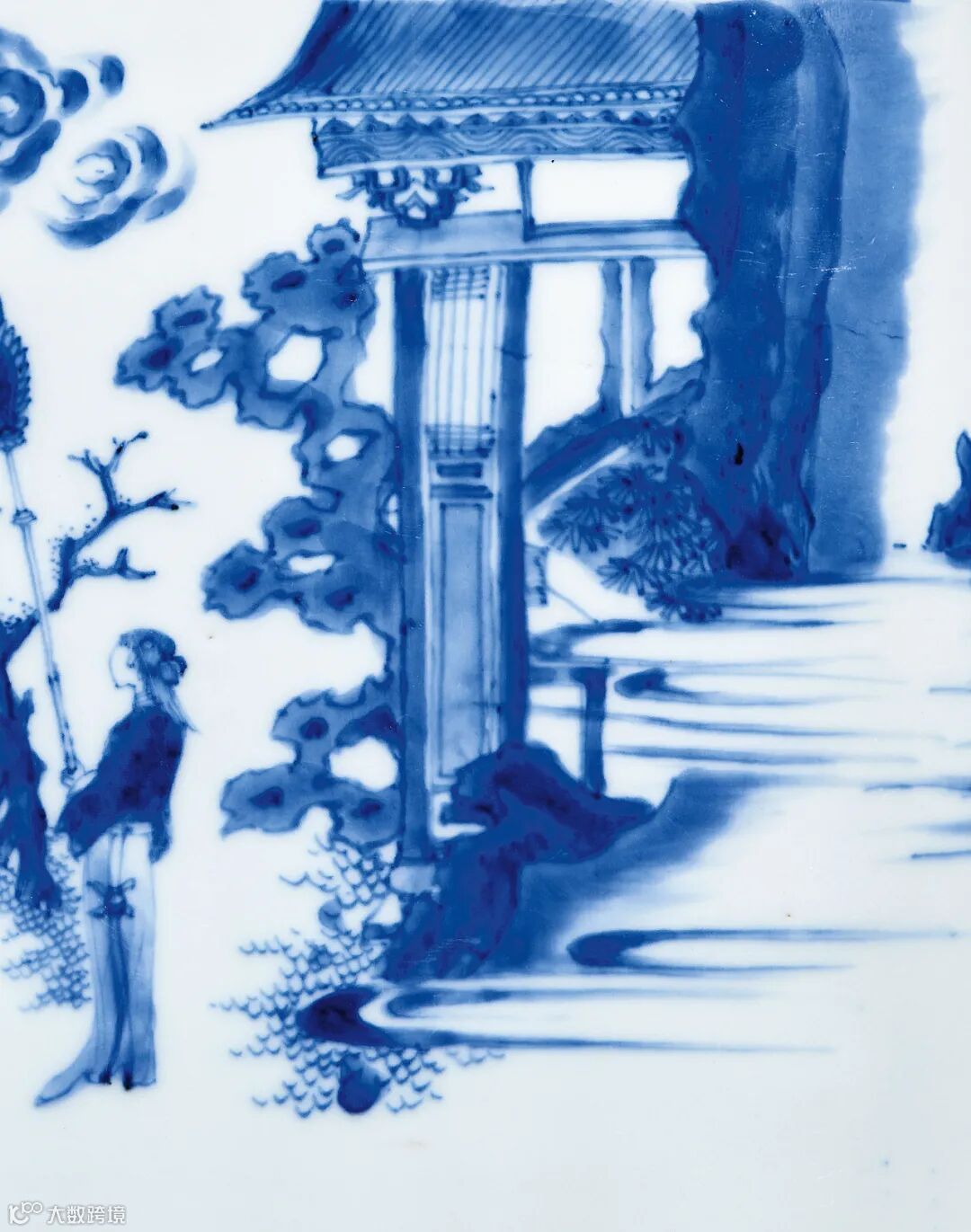 经历过多代的演变和发展,至崇祯朝,明末清初青花瓷器的典型风格已经逐渐确立起来。沿袭于天启年间对文人文化的追崇,此时期器物上多饰各种戏曲故事和历史典故的图案,描绘精湛,生动传神,且不少都配有隶书题记。本场2021春华·叁中的一只拍品通景所绘唐明皇游月宫图。唐时,玄宗下令在太液池西岸筑一百尺高台,专作赏月之用,称之“赏月台”,据《开元遗事》载:“中秋夕,上与贵妃临太液池望月”,之后便形成了唐明皇梦游月宫的传说,并广泛流传。