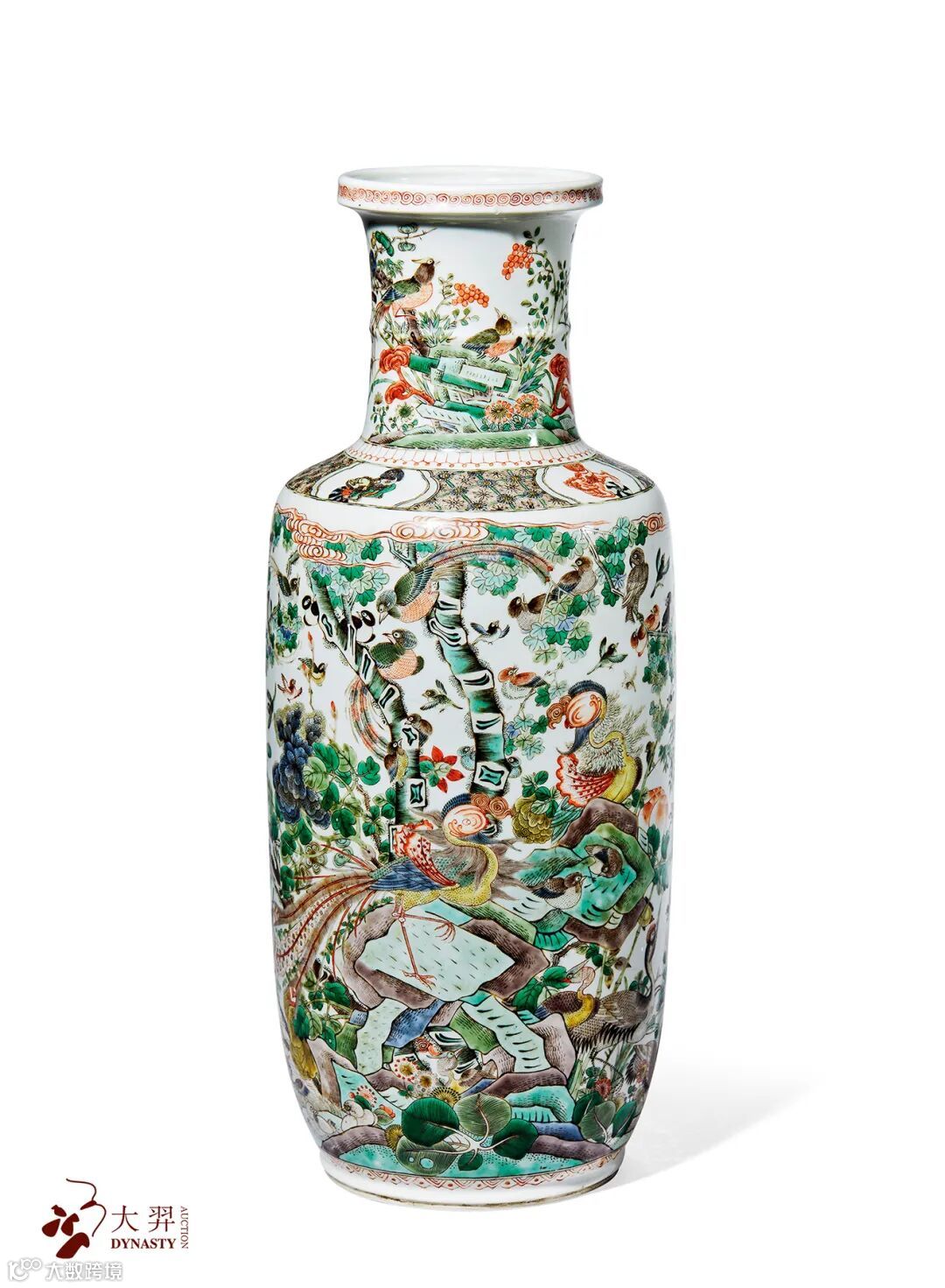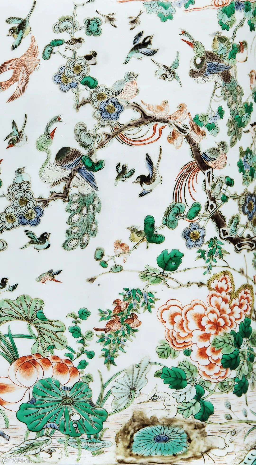 拍品形制高大挺拔,瓶身满绘百鸟朝凤图,绶带、孔雀、仙鹤、春燕、黄莺飞翔、穿梭于梧桐、玉兰、翠竹、牡丹之间,仪态雍容的凤凰昂首挺立,成为百鸟朝拜的中心,画面构图疏密得当,设色鲜丽典雅,绘画生动传神,百鸟朝凤是康熙时期常用的一种吉祥图案,后世亦多有延用。
