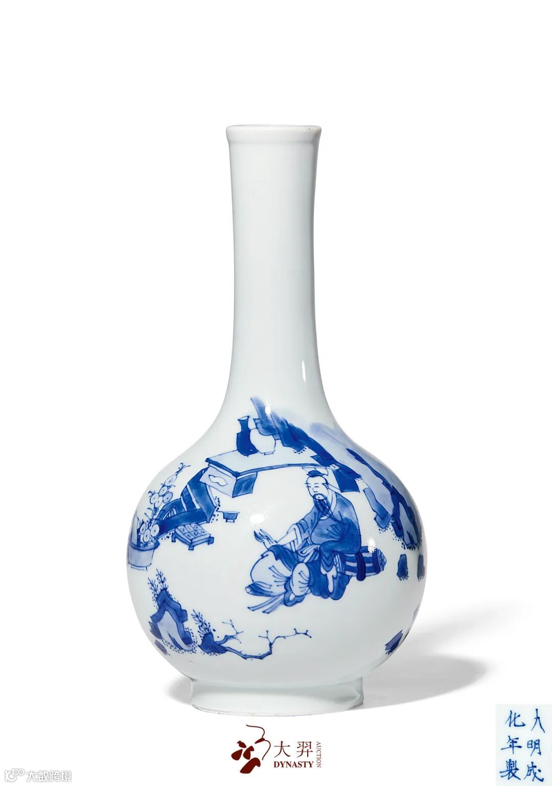 青花高士图长颈瓶 款识:“大明成化年制”六字双行楷书款 高:20.5 cm.
