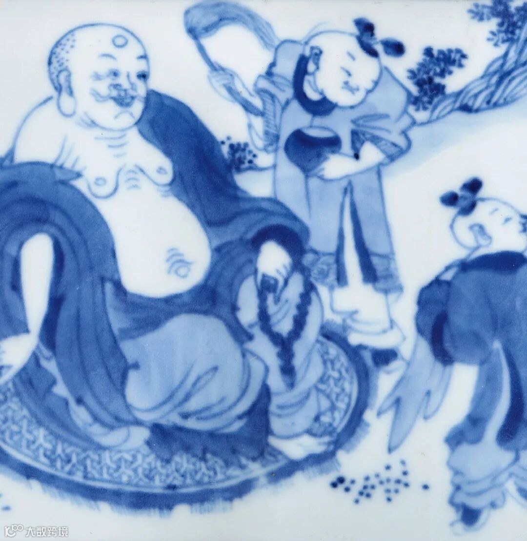 青花布袋和尚图三足炉 高:12 cm.