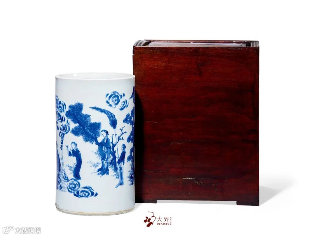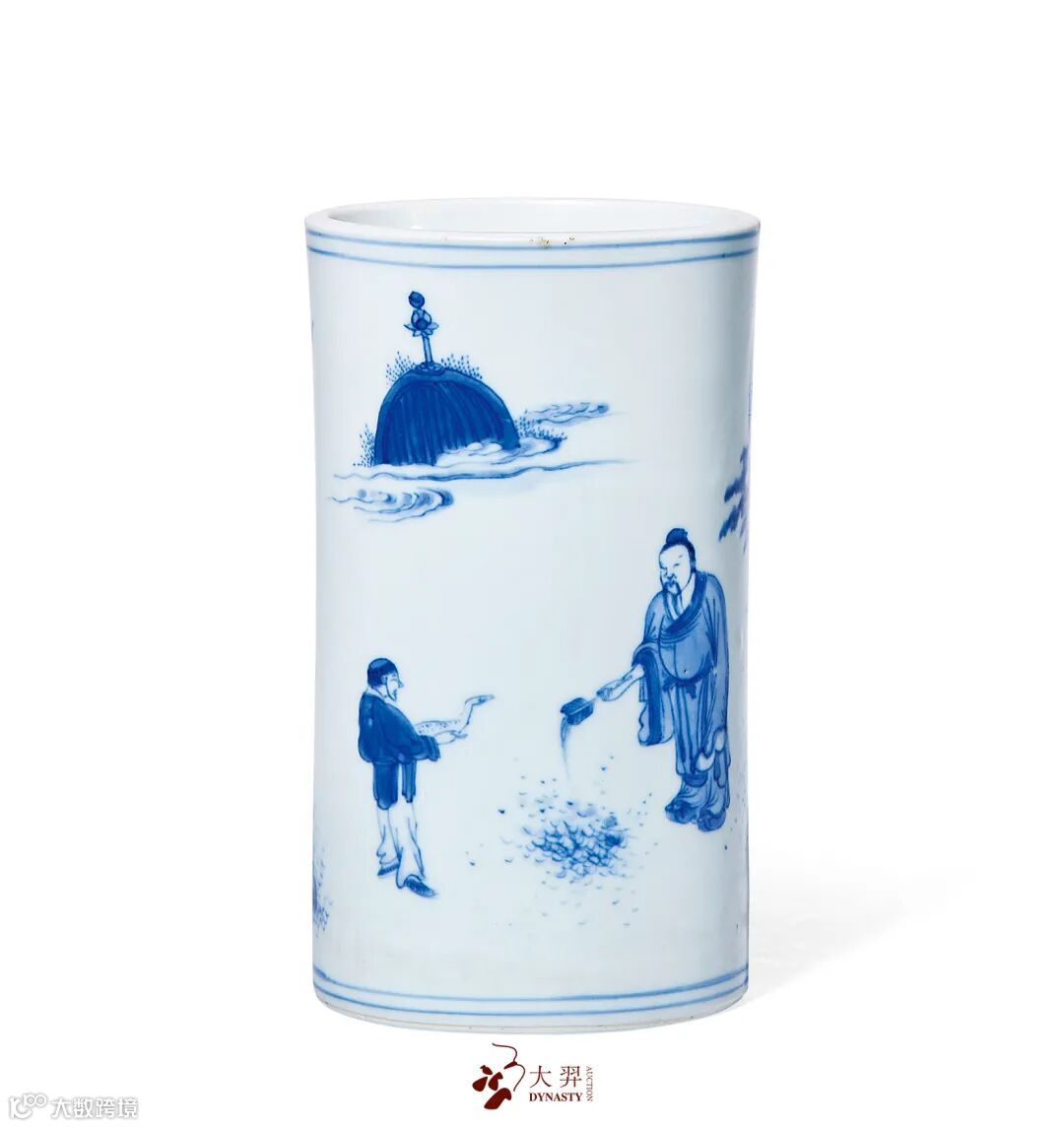 此笔筒青花发色明快清亮,整体气息飘逸潇洒,人物神情生动自然,画法精准爽落。胎体坚白细腻,内外施透明釉,釉面均匀明净,细润平滑。外壁青花绘羲之爱鹅图,羲之面含喜色,迎面一童捧鹅欢颜而至。