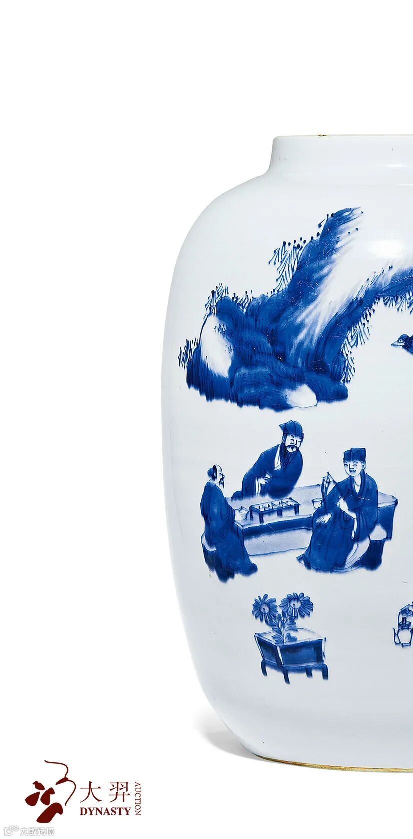 康熙一朝,以青花墨分五彩而名噪一时。康熙青花瓷以胎釉精细,青花鲜艳,造型古朴多样,纹饰优美而负盛名。青花瓷造型特色非常鲜明,已经逐步摆脱了明代瓷器粗笨的特点。无论从胎质、釉彩,还是造型、纹饰等方面都追求精益求精,器形多样而雄浑,整体表现出了规矩、挺拔、大气和豪放的特色。本场拍品中的康熙青花赏心十六事诗纹太白罐,器型挺拔遒劲,体罩施白釉,釉质白中闪青,足端露胎处可见胎体细腻坚实。此罐就充分反映了康熙时期青花瓷器的主要特点,通体以青花为饰,描绘着隐士坐于石台之上品茗对弈之景,构图疏朗得当,皴法娴熟,隐逸之情别具。另侧所书诗文为苏轼《赏心十六事》,诗赋图画相映成趣,题材不羁而洒脱,充分反映了明末清初时期独特的艺术特征。