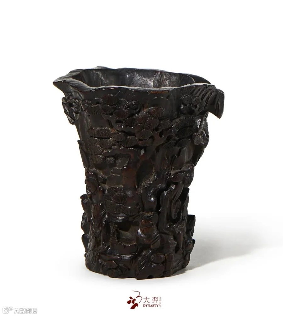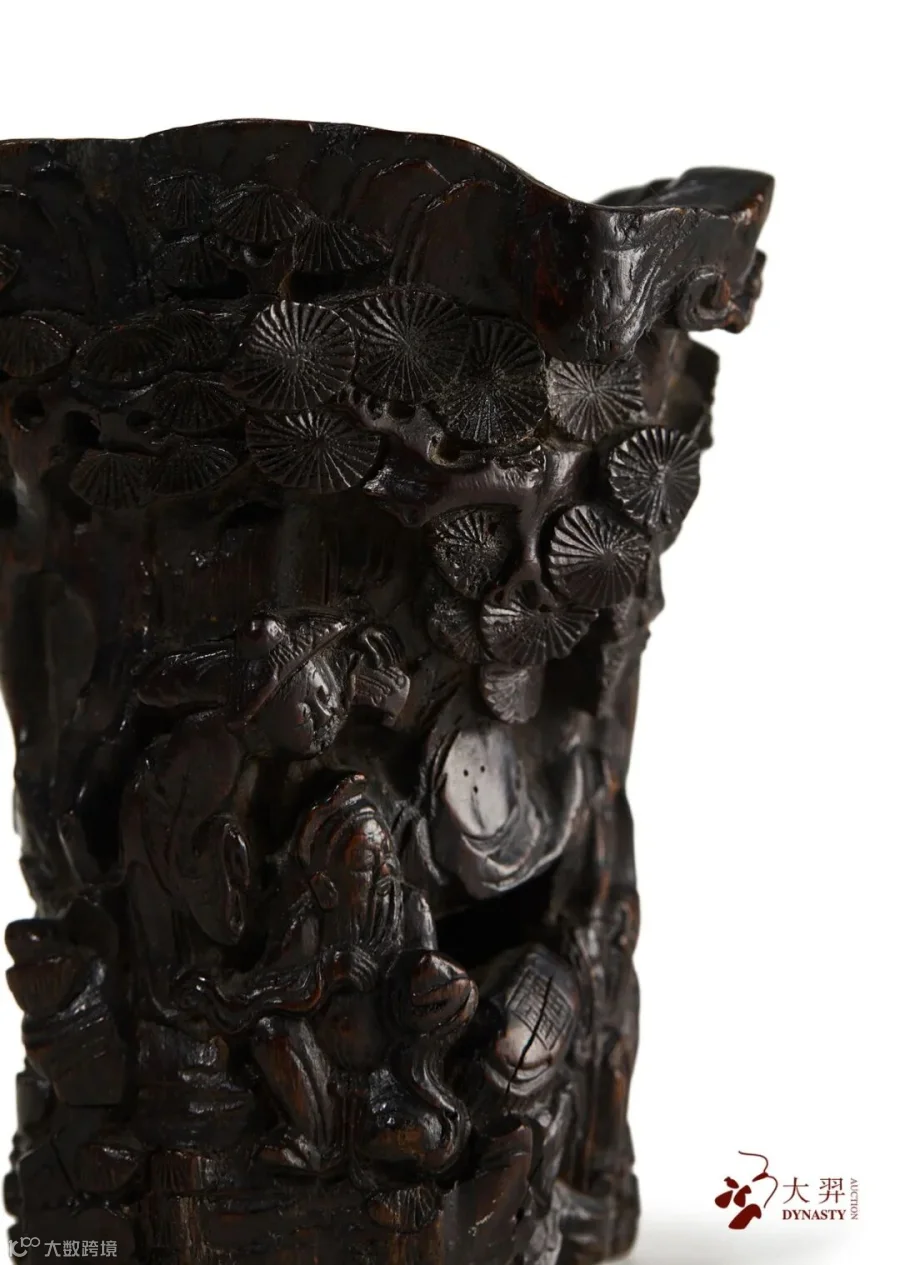 此件清代松下对弈图笔筒以沉香制成,此笔筒雕工精美,线条凌厉分明,笔筒表面精细雕刻有一幅生动的松下对弈图,通过精细的线条依稀可见几位仙风道骨的高士正在松下对弈,景致清幽,雅趣十足,构图布局合理,刀工娴熟老道,枝叶、景物细节刻画极为清晰,人景合一,力度十足,足可见匠人雕刻技巧。同时期此题材的笔筒多为竹雕,因此该沉香制笔筒更显难得珍贵,为不可多得的文人书房陈设器物。