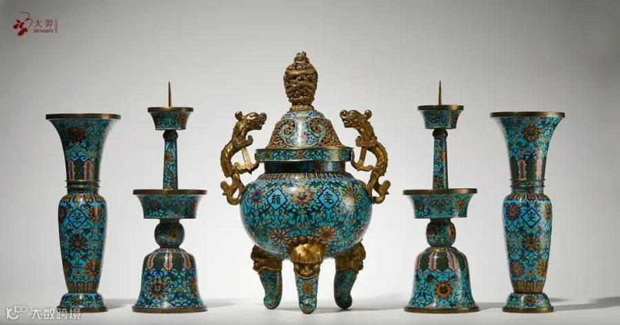 五供是供奉或祭祀用器,包括一对花觚、一对烛台和一个香炉,其造型多仿制青铜器,在清代乾隆朝较为流行。这套五供以青蓝釉色为地色,以双勾边线技法勾勒出轮廓线,在缠枝莲花纹中分别填以红、黄、蓝、绿等多种色彩,明丽鲜艳,于表面显出微微透亮之感,恰似镶嵌的宝石。将铜胎珐琅富丽堂皇的色彩特点发挥得惟妙惟肖。主题纹饰为缠枝莲纹,画面上莲花枝繁叶茂,满布器身,呈缠枝花状,威严精巧。香炉顶部带有穿孔的圆形顶盖,末端两侧饰以金龙,气势十足。花瓶腰身细长,线条流畅柔美,烛台支撑在高圆顶底座之上。这套五供的每件器物造型皆饱满圆润,色泽华彩绚丽,画面繁缛满密,绘工精致细腻,釉色纯正、鲜艳,掐丝粗细均匀、流畅,纹饰刻画精细,为同时期铜胎掐丝珐琅五供之中之精品。
