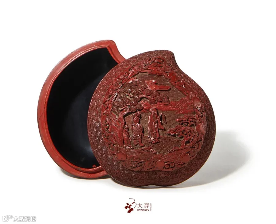此件剔红盒为木胎,呈桃形。雕刻“吕洞宾渡柳树精”,是中国古代仙人伏妖成仙的民间传说,元代谷子敬在《吕洞宾三度城南柳》中曾写到吕洞宾到岳阳楼渡化一柳树精成仙的故事。1609年出版的百科全书《三才图会》,在描绘吕洞宾时也绘出了一树精于吕洞宾身旁,显示十七世纪吕洞宾和树精的图示极为流行,此件桃形盒为乾隆时期所制。整体人物构思有趣,造型生动活泼,线条流畅生动,具有很强的写实性,工巧写实,甚是生动,漆色红润纯正,刀法纯熟,纹饰细巧,制作精良。盒内壁髹黑漆。漆层鲜艳厚重,剜刻遒劲粗放,从侧面依稀可见漆层之层次,其用料之精、工时之长可见一斑。整器呈寿桃形,浑然一体,构思奇巧,实属难得之雅玩。