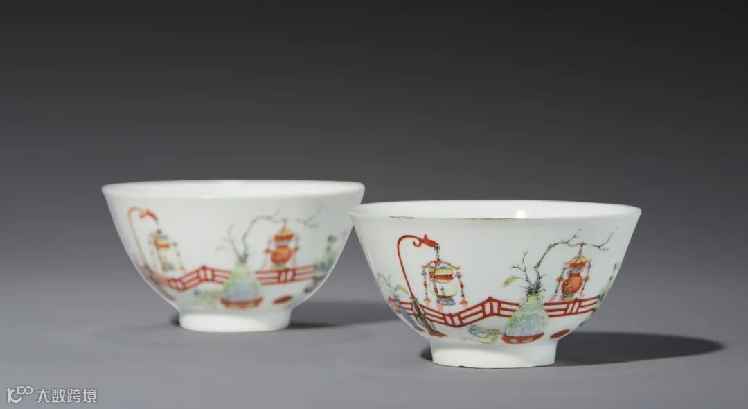 LOT125 清光绪 青花胭脂红料八仙祝寿图碗一对