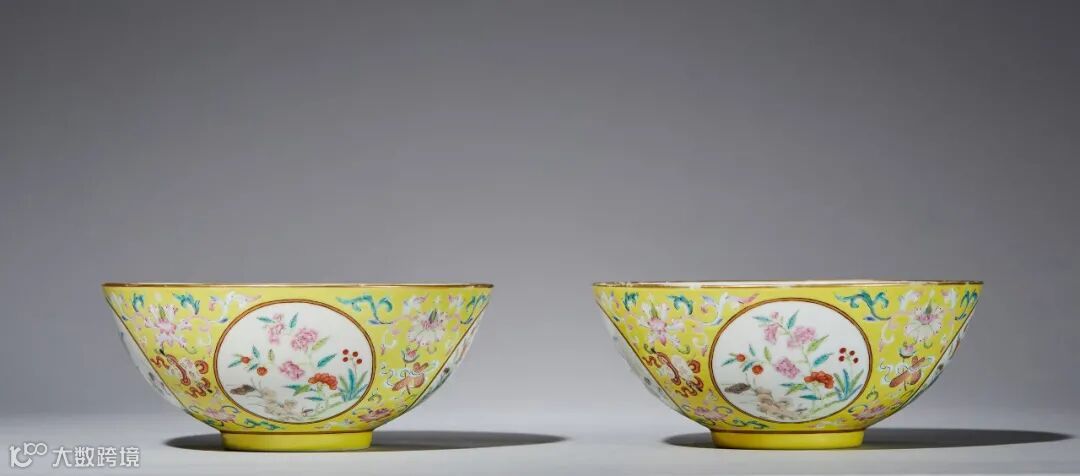 LOT116 清道光 黄地粉彩开光四季花卉纹碗一对