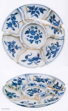 2006年对大窑枫洞岩窑址的发掘,清理了清晰的洪武和永乐时期的地层,据此总结出了洪武(图一)和永乐时期(图二)龙泉窑官器的特征。然而,文献记载宣德到天顺时期龙泉窑依然在生产官器,但在枫洞岩窑址并未发现这一阶段的遗物,加之龙泉窑的官器一直不书图一、大窑枫洞岩窑址出土洪武时期官器写年号,因此我们并不了解宣德到天顺时期龙泉窑官器的具体面貌。这件龙泉窑官器大盘,在釉色和纹样特征上与枫洞岩窑址出土的洪武、永乐时期的龙泉窑官器有一定的差距,而对比景德镇宣德官窑青花瓷器的纹样,却与此器有相似之处。如2002年发掘景德镇御窑厂遗址珠山北麓区域出土的宣德青花果盘,在盘的中心部分绘画菊花纹,边部分绘六枝折枝花果纹(图三),纹样的细部和总体布局上均与这件龙泉窑大盘相似,应是来自同样的纹饰粉本。这种底部画主体纹饰,腹壁画6-7枝不同的折枝花果纹的布局,再景德镇宣德年间的青花瓷上十分流行,不胜枚举;如台北故宫收藏一件宣德官窑青花花果纹碗,碗的背面以圈足为中心,构成宝相花,外图二、 大窑枫洞岩出土永乐时期官器壁则画出六种不同的花果纹(图四),从布局与各种折枝花的细部都与这件龙泉窑大盘相似。此外,这件大盘翠青色的釉色与洪武、永乐时期以青绿色为主的釉色有差异,并不多见,是宣德时才开始流行的釉色。