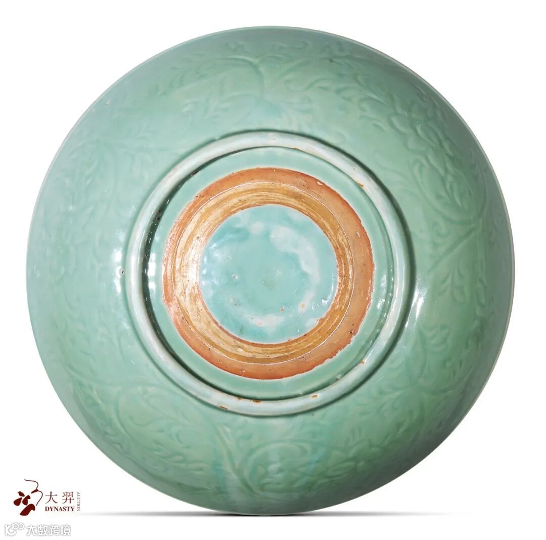 2006年,浙江省文物考古研究所和北京大学考古文博学院联合发掘了大窑枫洞岩窑址,这处窑址是明初生产贡御瓷器的地点,通过发掘,总结出了明代官器的特点,使人们对龙泉官器有了清初的认知。这件大盘从规整的造型、浅淡细腻的胎质,翠青色厚釉,均净温润的釉质,刻花装饰和纹样,特别是一丝不苟刮出的涩圈和支烧痕迹,都与龙泉窑官器的特征相符,是一件典型的明代前期的官器,十分稀有珍贵。此器曾于2015年在保利艺术博物馆举办的“远山晚翠”展览中展出并著录于展览图录中。