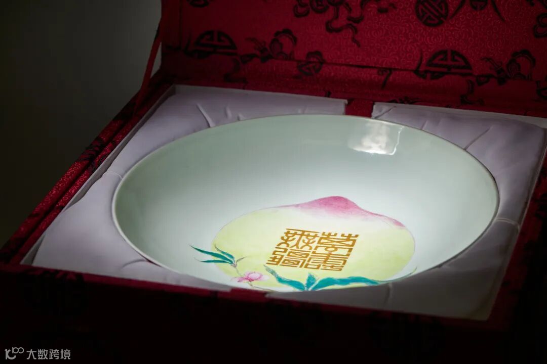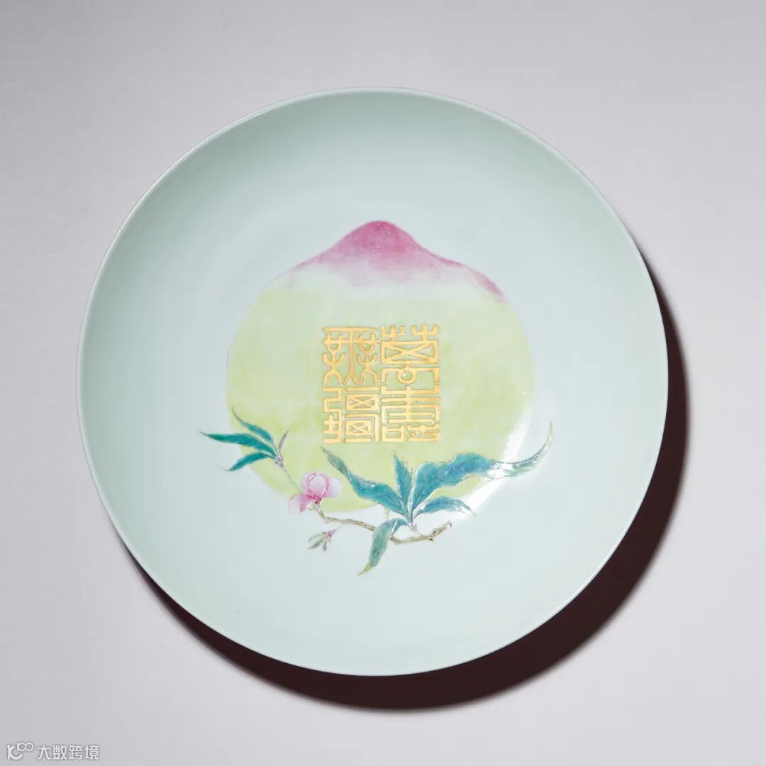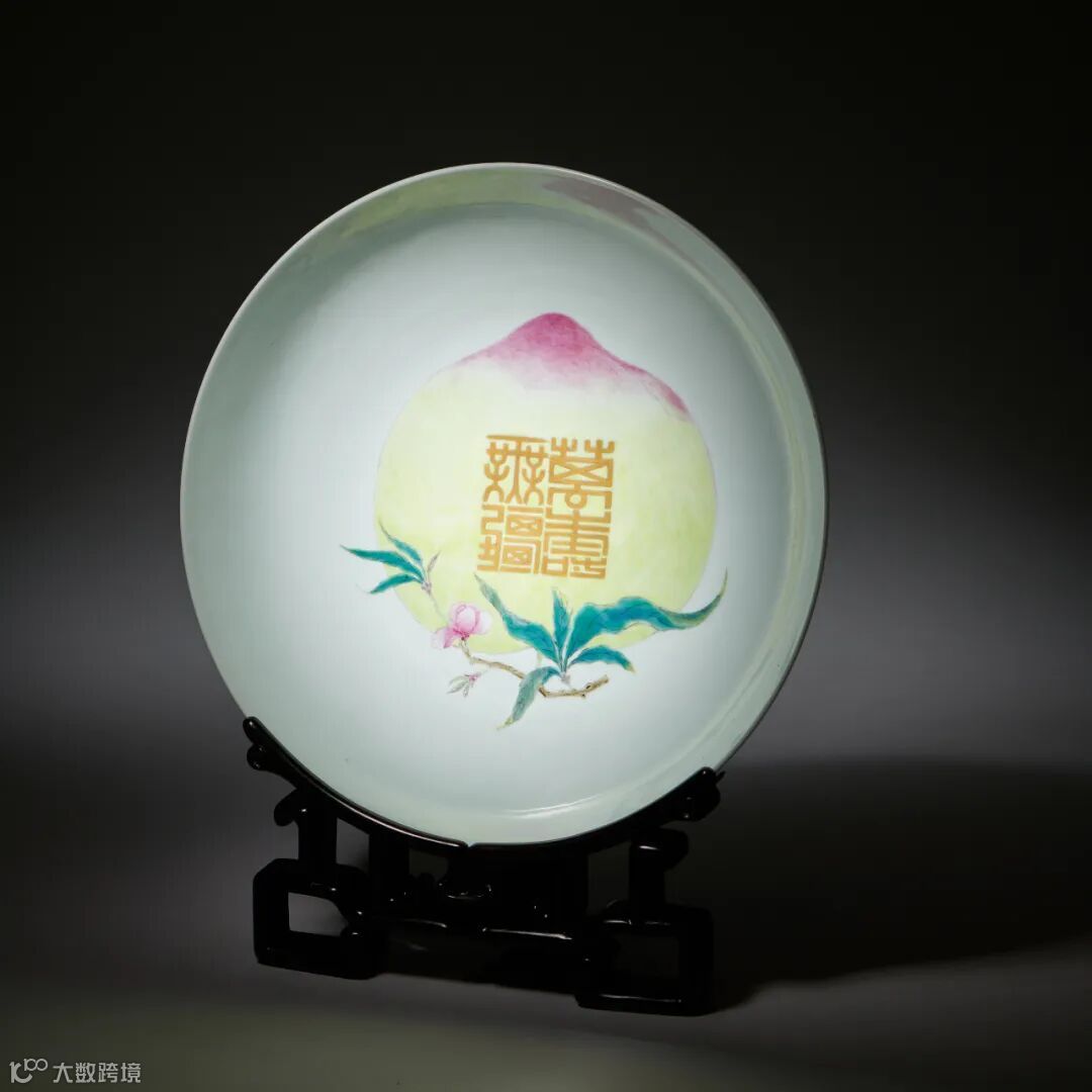 清雍正 胭脂红釉内粉彩“万寿无疆”桃纹盘以硕大饱满的寿桃形象寓意长寿,为雍正帝万寿节所用。纹饰描绘入微,饱满莹润,枝叶繁茂,经脉毕现;画工新颖别致、细腻典雅,施彩技术亦妙至毫巅。