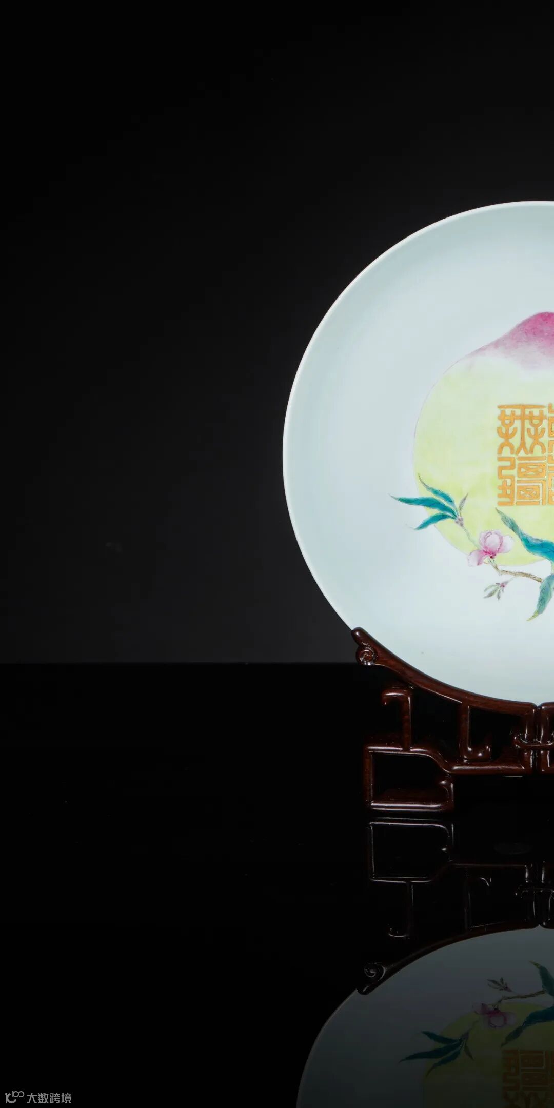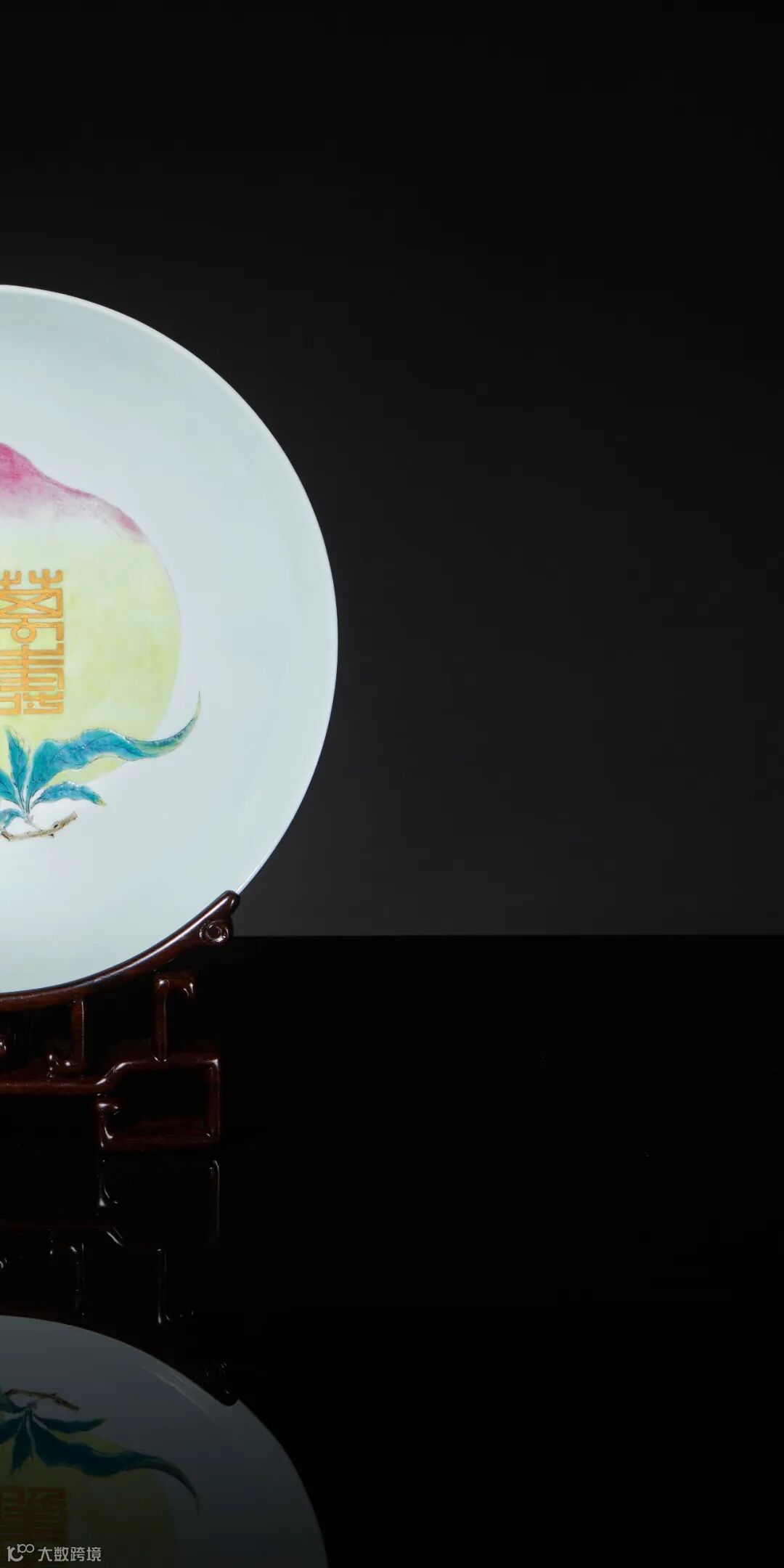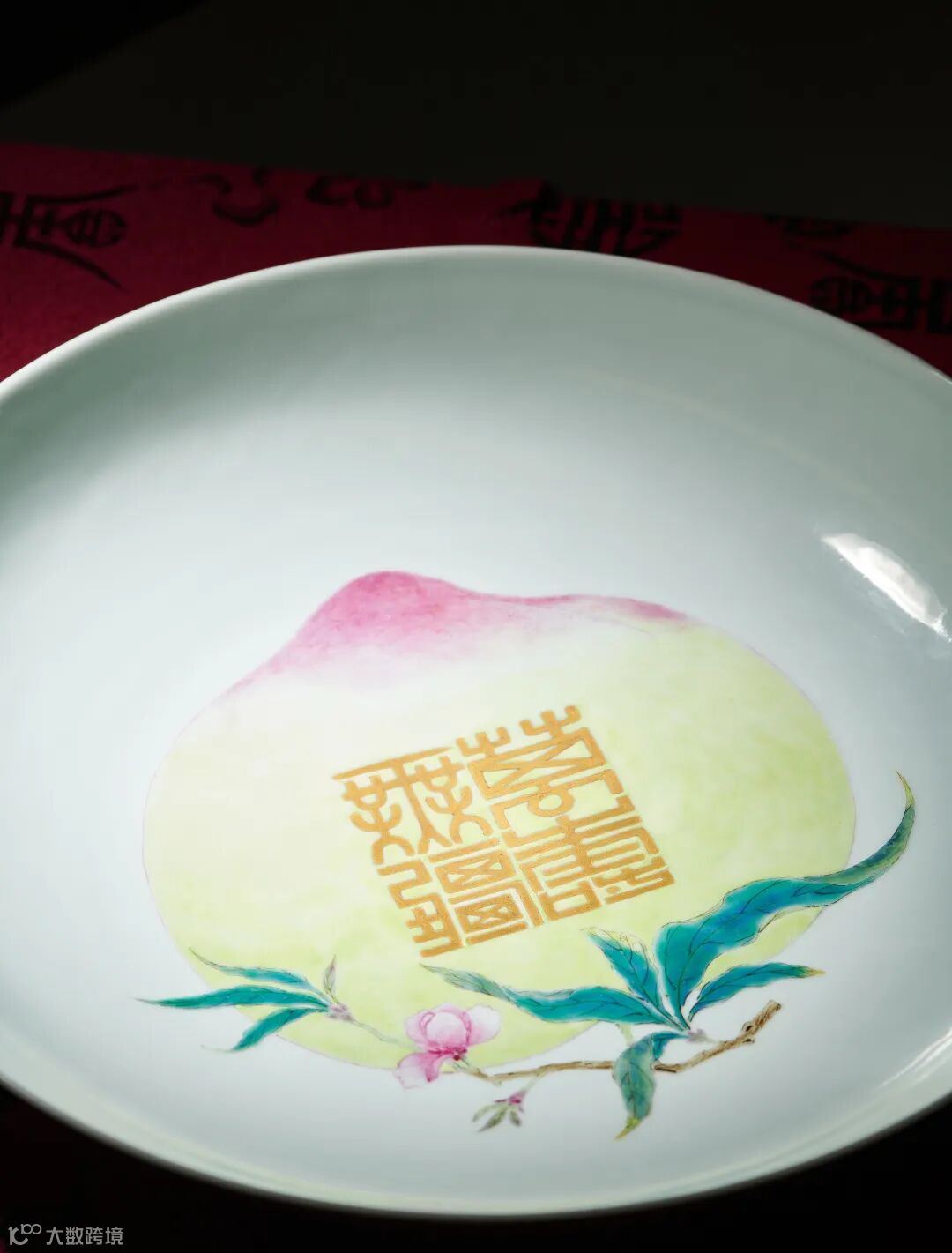 清雍正 胭脂红釉内粉彩“万寿无疆”桃纹盘以硕大饱满的寿桃形象寓意长寿,为雍正帝万寿节所用。纹饰描绘入微,饱满莹润,枝叶繁茂,经脉毕现;画工新颖别致、细腻典雅,施彩技术亦妙至毫巅。
