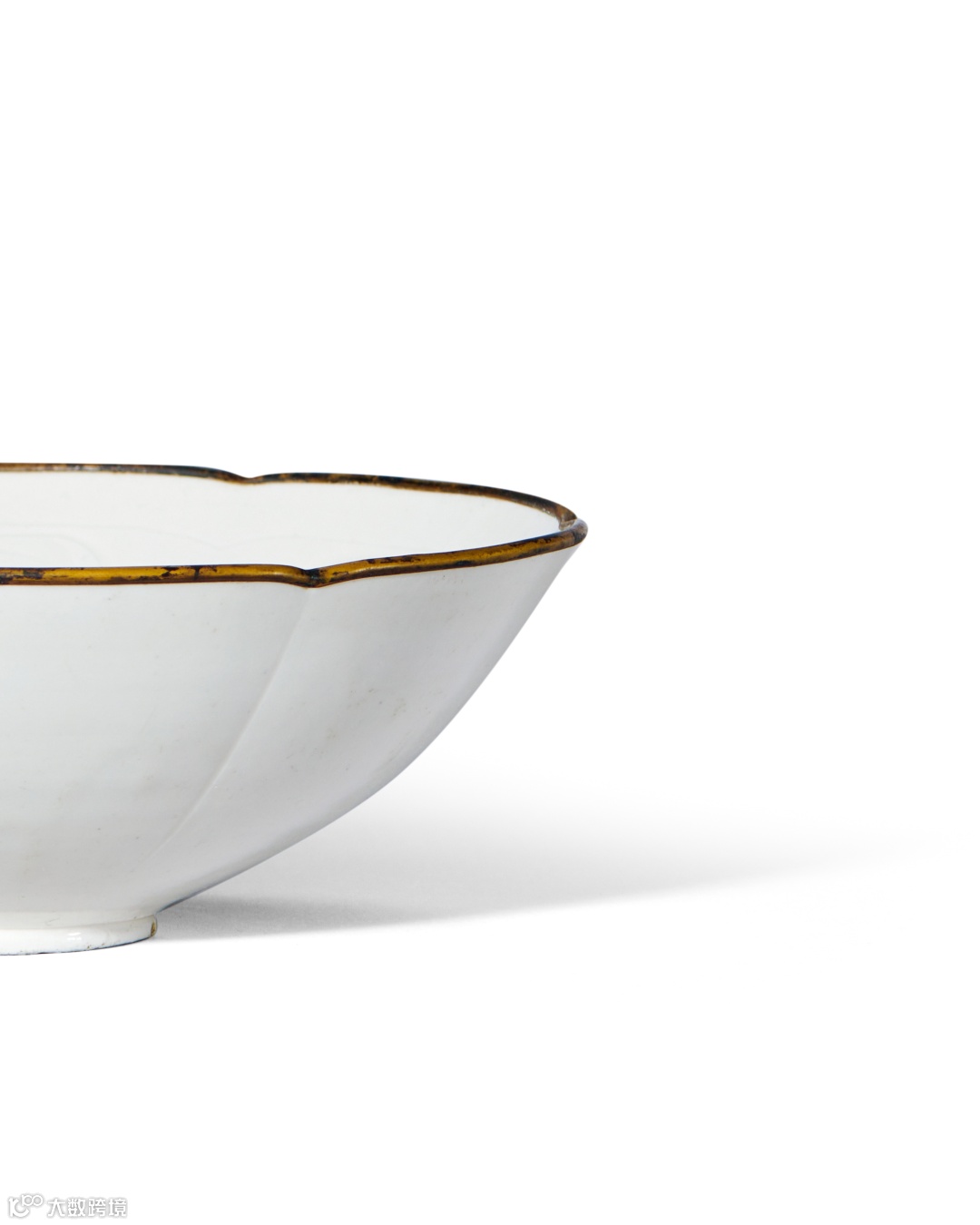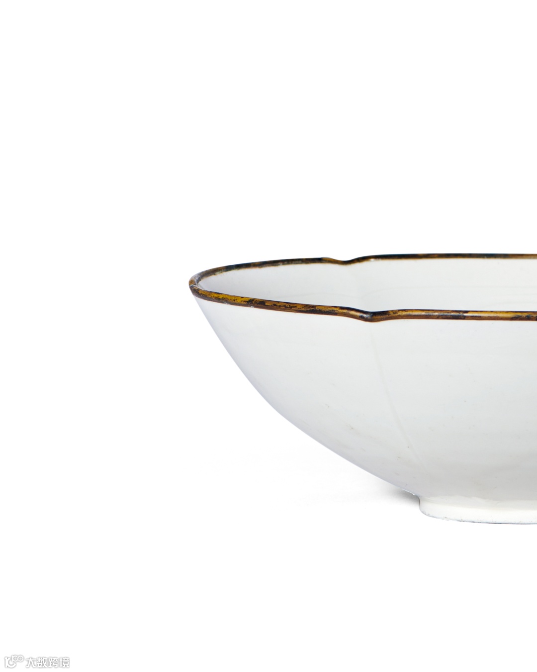 斜壁微弧,圈足,足部满釉,口缘镶嵌铜棱扣。碗壁随花口呼应装饰棱线,整个碗如花瓣形盛开。通体施白釉,外壁光素,有泪痕现象。碗内篦划单朵大牡丹纹, 疏密有致,有留白之境,宛如宋画。