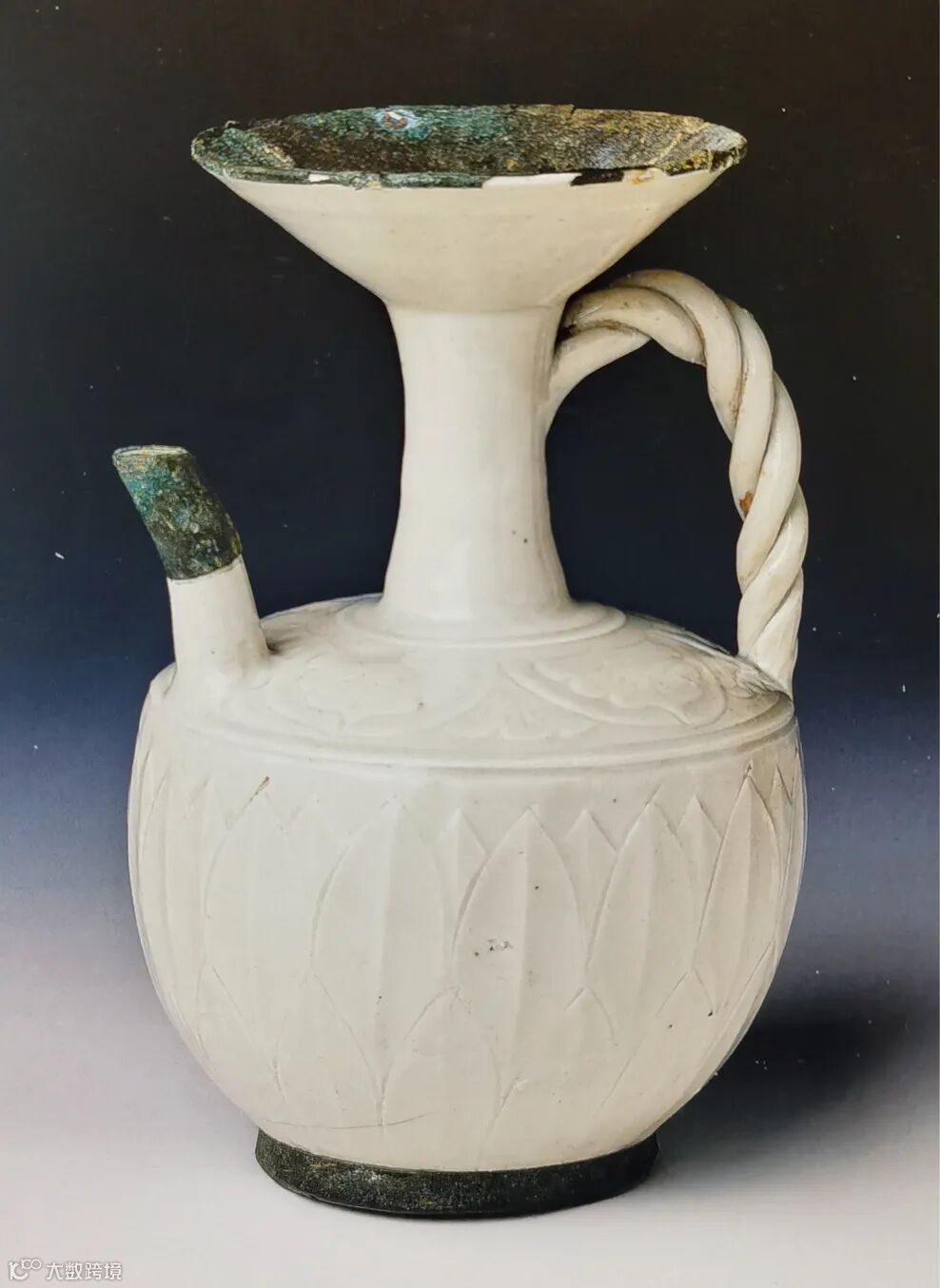 本品通体施白釉,丰肩,圈足。造型独特为定窑烧造,其功用为酒具中斟酒所用的酒壶。器身满刻当时定窑所流行的仰覆莲纹,刀刀见泥,细致入微,值得注意的是,这件执壶的柄部造型奇特,为仿绳纹柄,在制作此柄时,需要将两泥条相互缠绕塑形,极具巧思。在使用过程中,这样的设计亦有防滑的奇效,可见古人对于实用性与观赏性的兼顾设计。