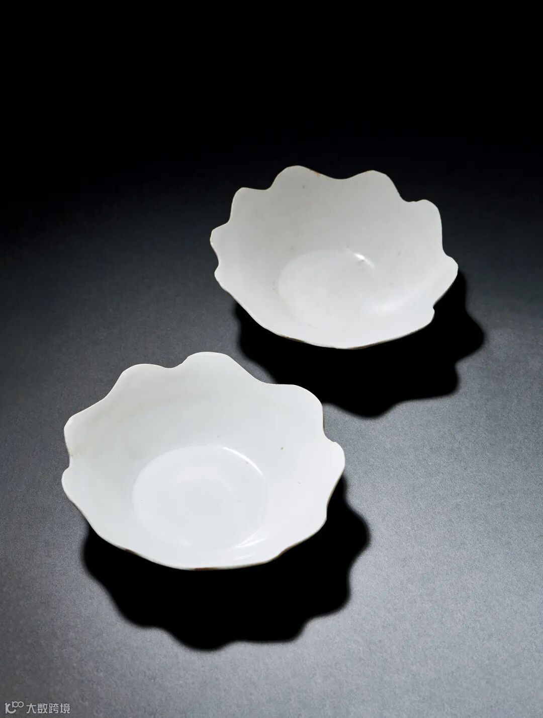 口沿呈规律花口状,十花口,斜直壁,高圈足,通体施白釉,底部露胎,胎质洁白细腻。造型系仿金银器,花口口沿,需要在拉坯成型后借助模具来压制成形。同类型的花口盘还有三瓣形、五瓣形等带刺尖的多种花口样式。这种造型的器物主要流行在五代时期,最早的也可以追述到晚唐,在临安的水邱氏墓里面就出土了很多件这类花口造型的盘子,从墓葬信息来看,此类器物多出现在高规格的墓葬之中。