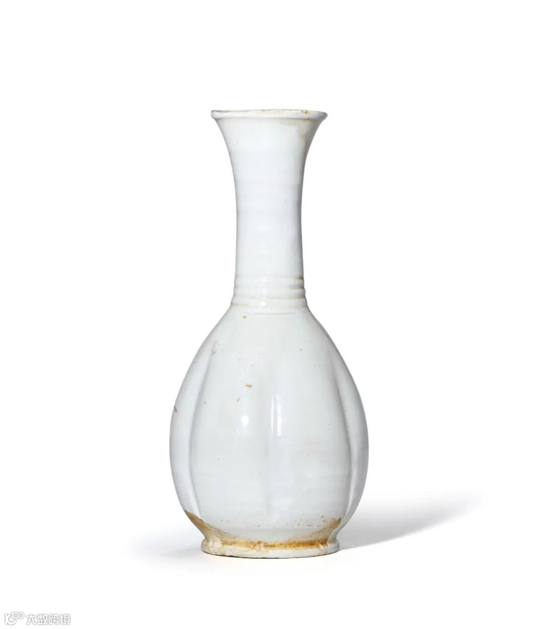 整体呈玉壶春造型,口沿微外撇,颈部有弦纹装饰,腹部做瓜棱形处理,圈足,通体施白釉,底部露胎。器型小巧可爱,常见的定窑玉壶春多为大器,且光素无纹或做刻划花卉纹饰,而本件器物的装饰特殊,为口部弦纹,并在腹部辅以瓜棱装饰,较为罕见。同类器物见大英博物馆收藏一例,整体造型尺寸与本品基本一致。