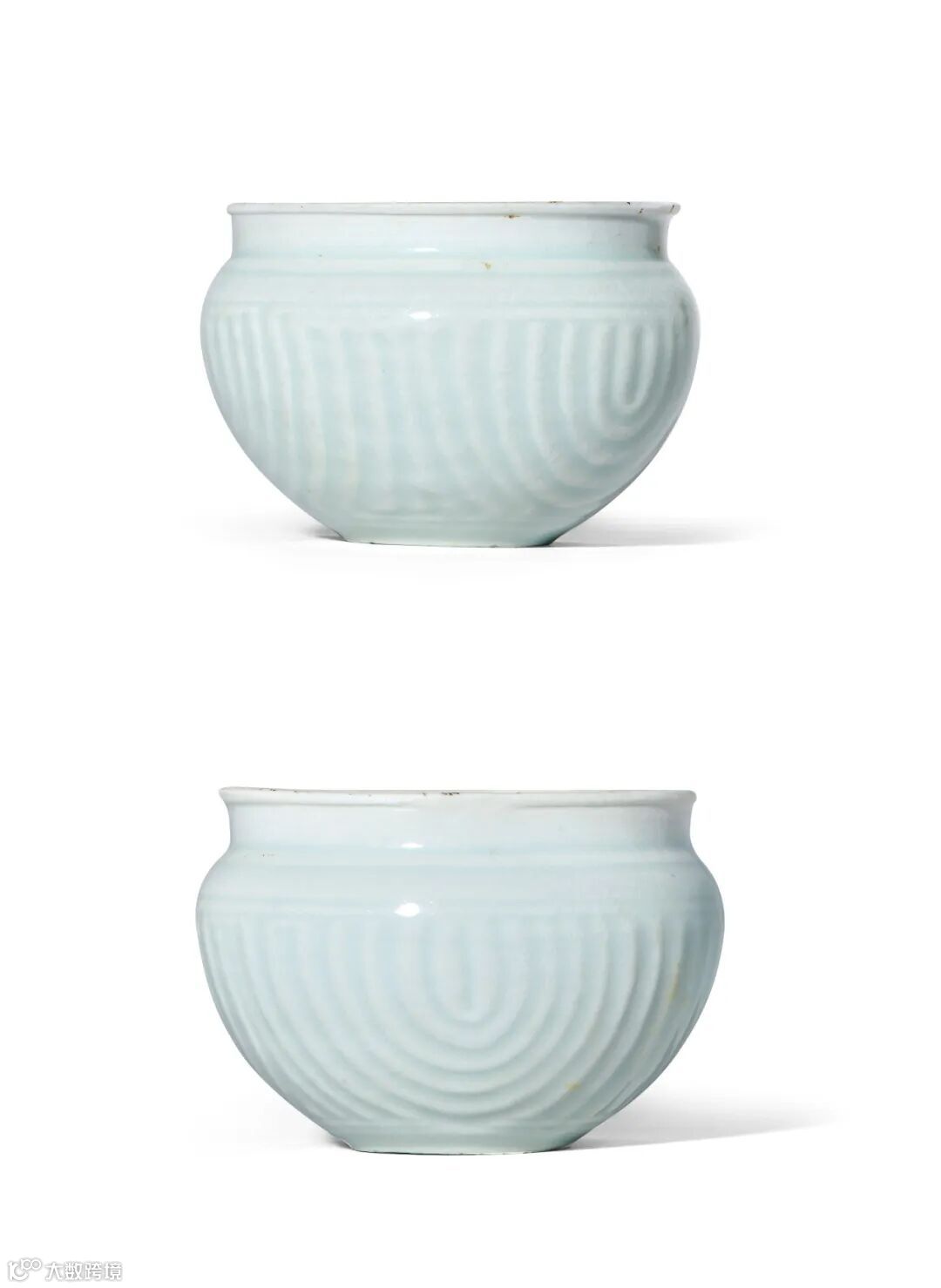 而本件器物为江西景德镇窑生产,较为少见,同类器物见法国集美博物馆藏一例,该例制作工艺略有差异,口沿满釉,底部露胎,另见国内影青专着《青白瓷精品鉴赏》收录一例,与本件器物同为芒口覆烧,尺寸稍大。