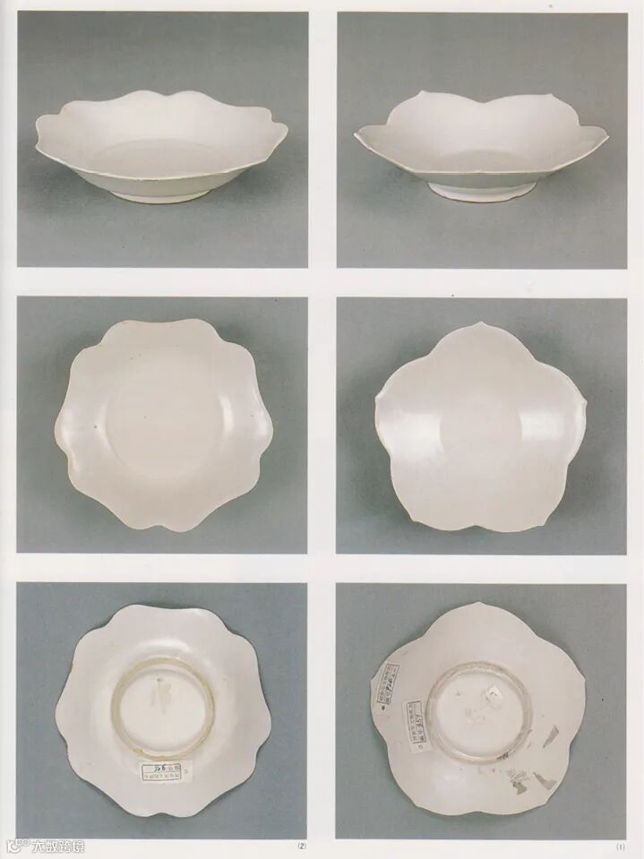 关于这类白瓷花口盘的生产窑口,目前存在一定的争议,或为河北定窑及安徽地区窑口生产,我们可以根据圈足特征,大致把目前所发现的该类型白瓷的花口盘分成两类。